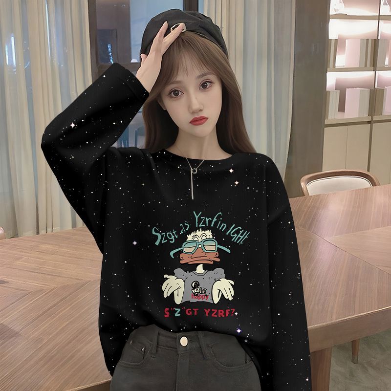 秋季圆领宽松显瘦黑色长袖T恤满天星设计感潮流中长款纯棉上衣服