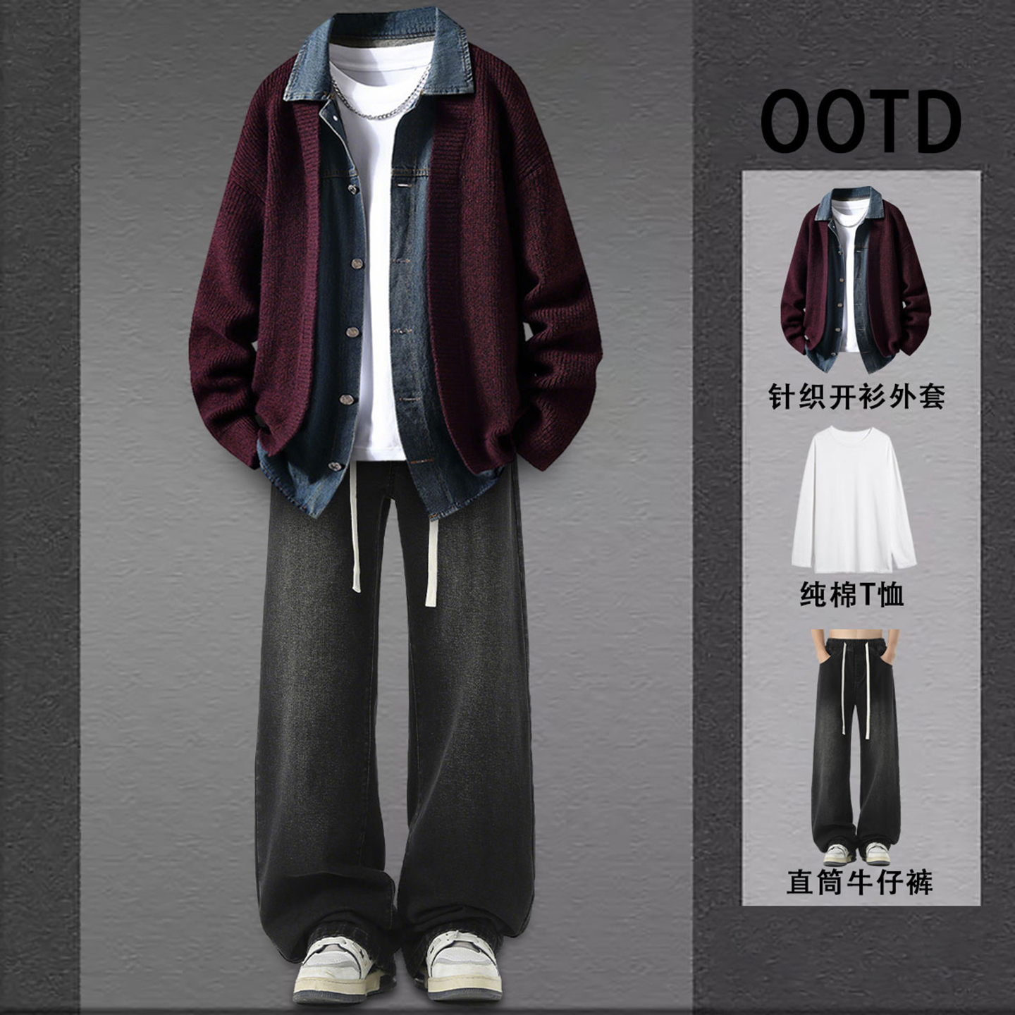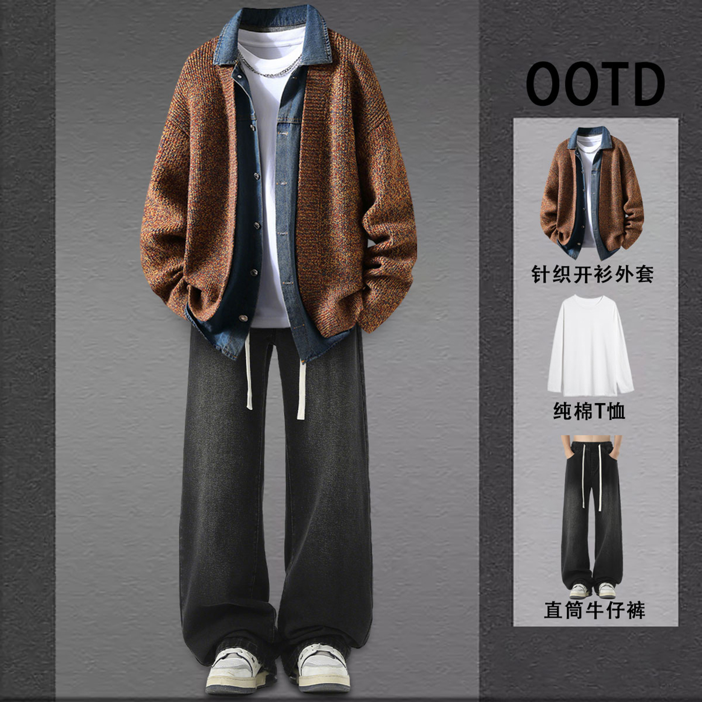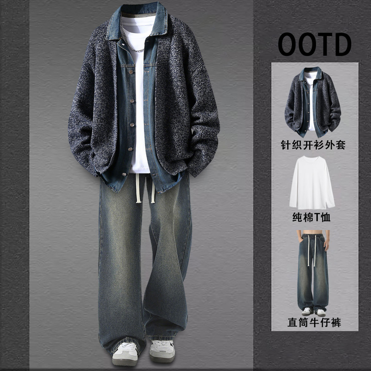 深灰色假两件牛仔拼接针织外套男秋装搭配一整套慵懒韩系开衫毛衣