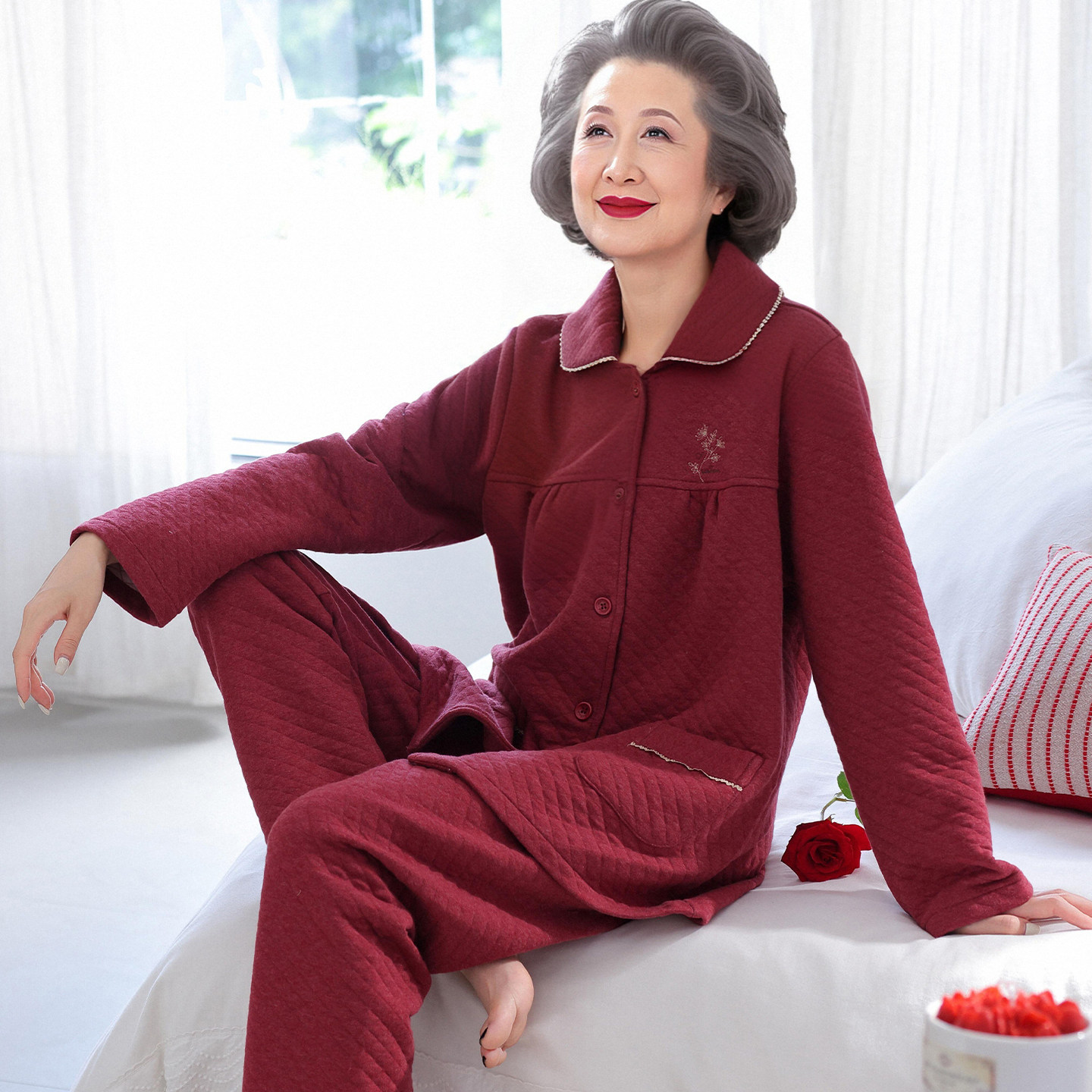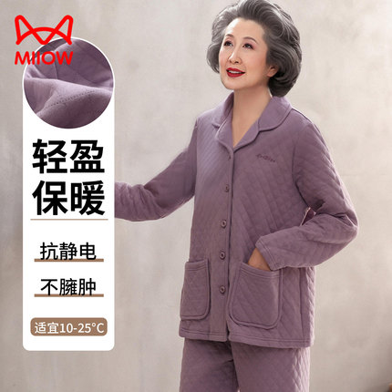 猫人睡衣女秋冬夹层纯棉长袖中年妈妈空气棉中老年5060多岁家居服
