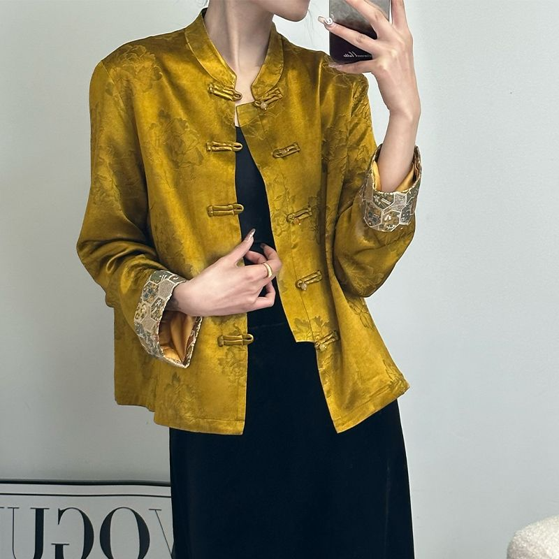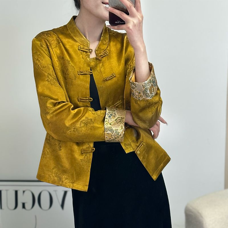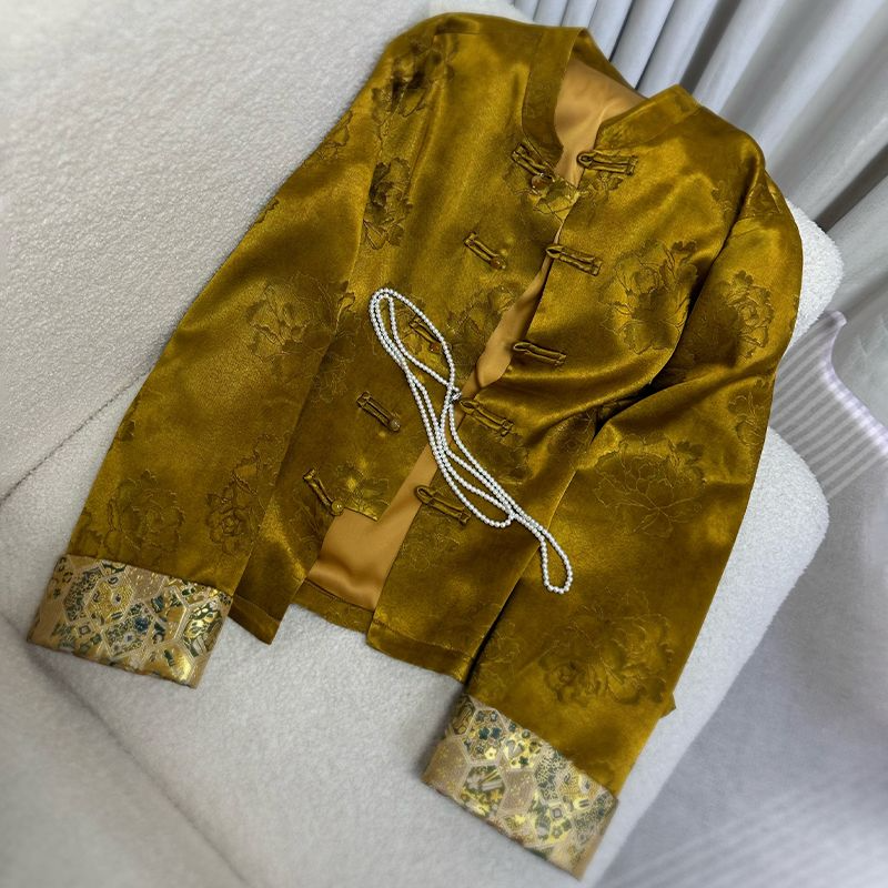 复古气质中式上衣女春季新品优雅国风提花盘扣挽袖短外套