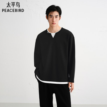 太平鸟男装撞色T恤春秋亨利领重磅长袖衫阔版假两件宽松打底衫
