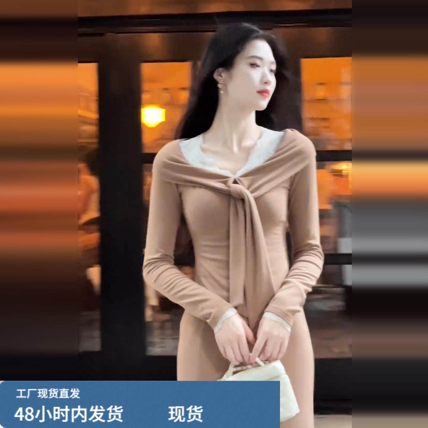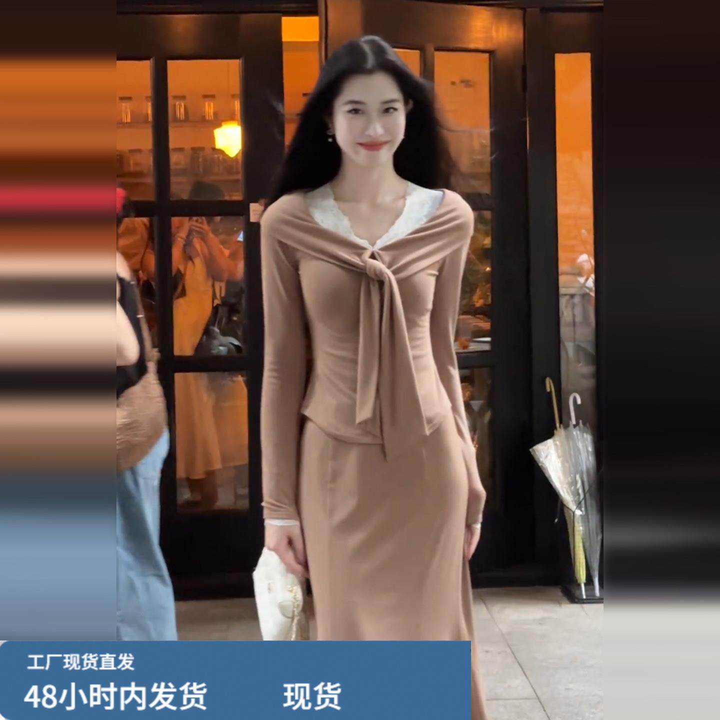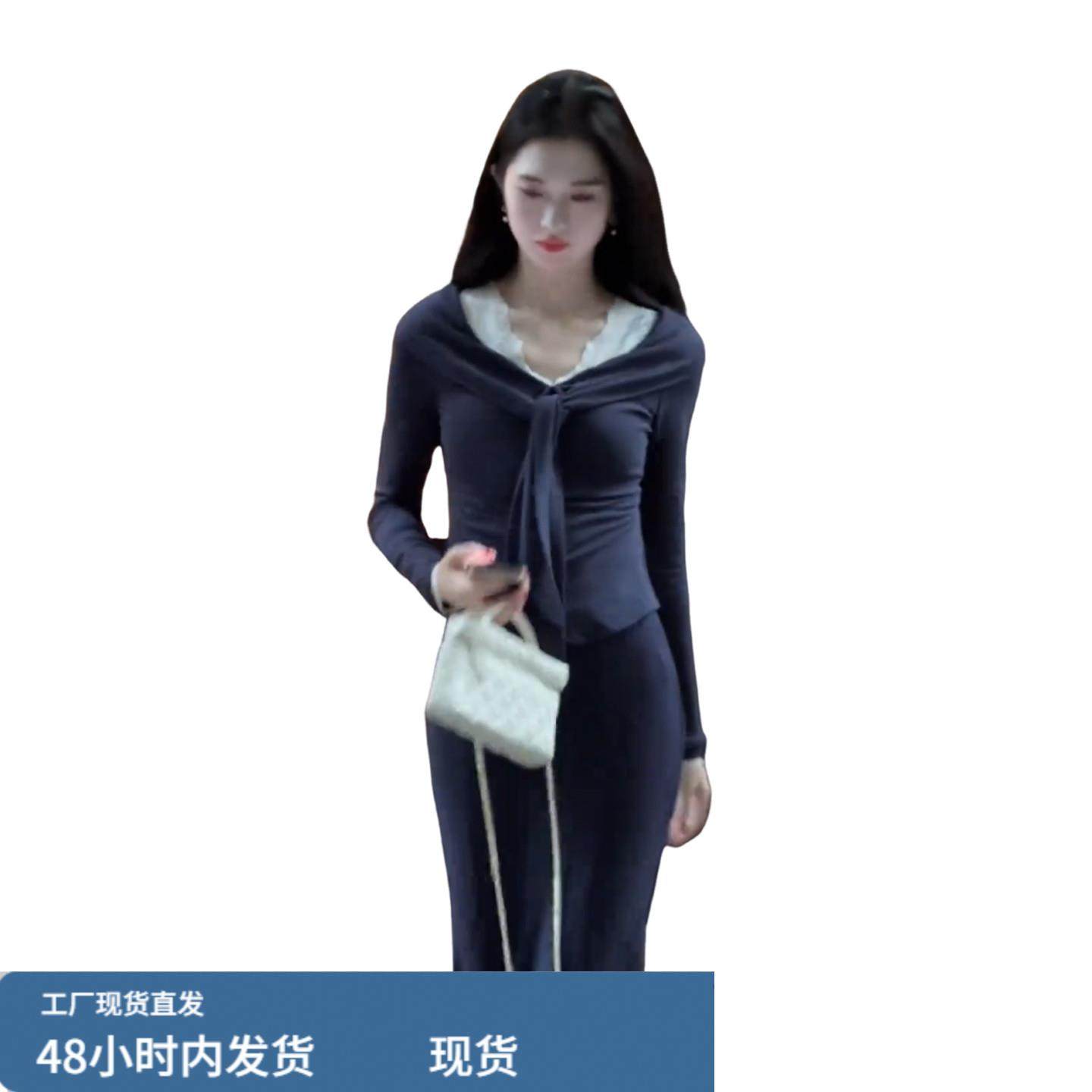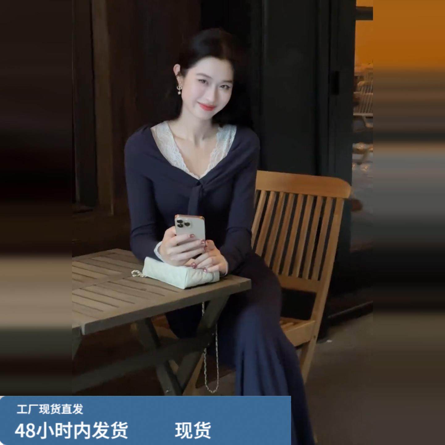 2025新款藏蓝披肩连衣裙子女秋冬法式气质蕾丝领收腰修身长裙套装