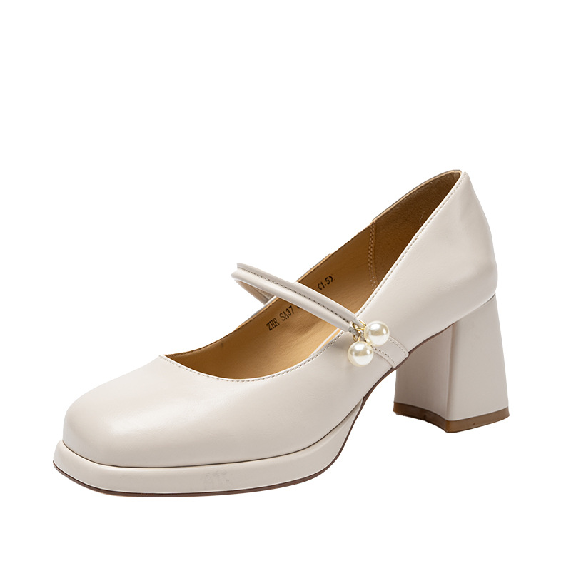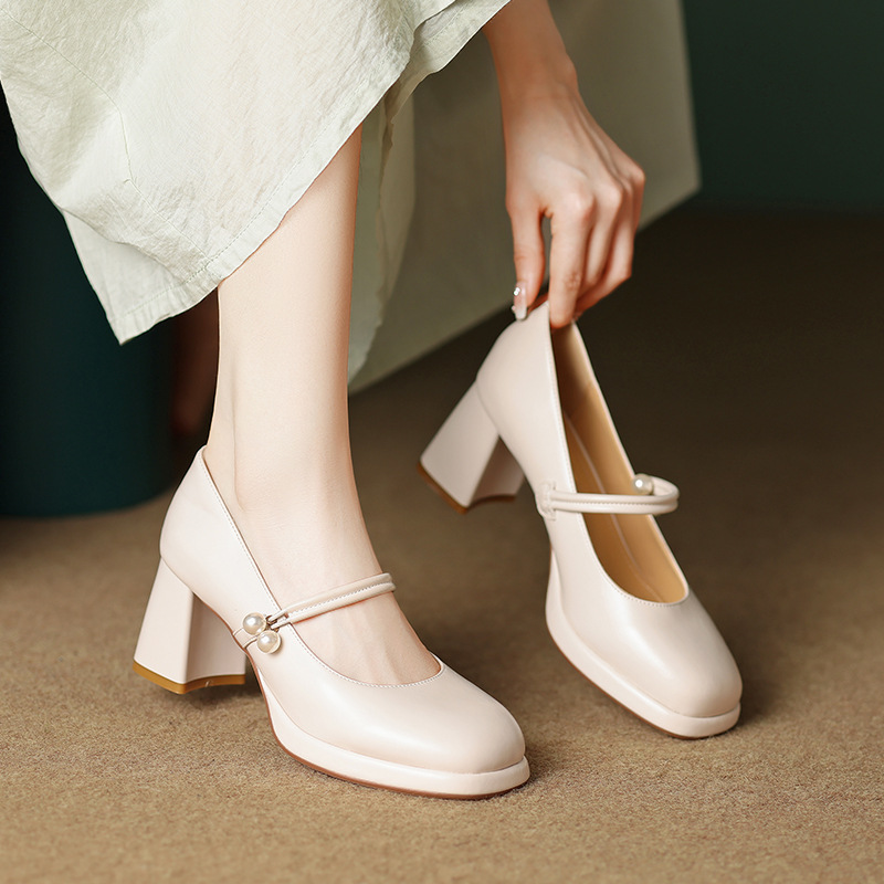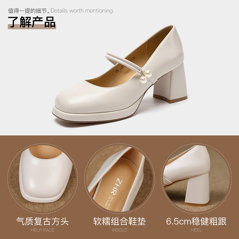 ZHR玛丽珍粗跟单鞋女2025珍珠法式高跟鞋一字带浅口小皮鞋女