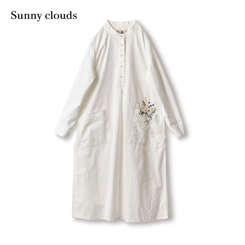 桑妮库拉/Sunny clouds 女式纯棉立领花束刺绣装饰长款衬衫(白)