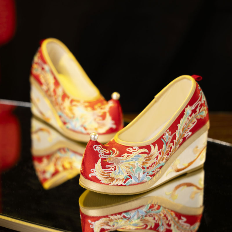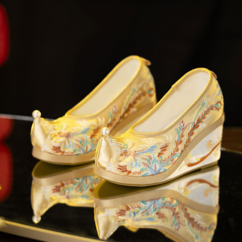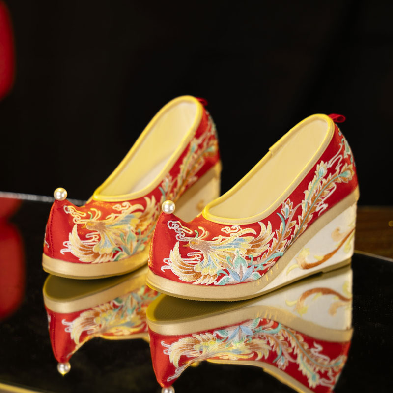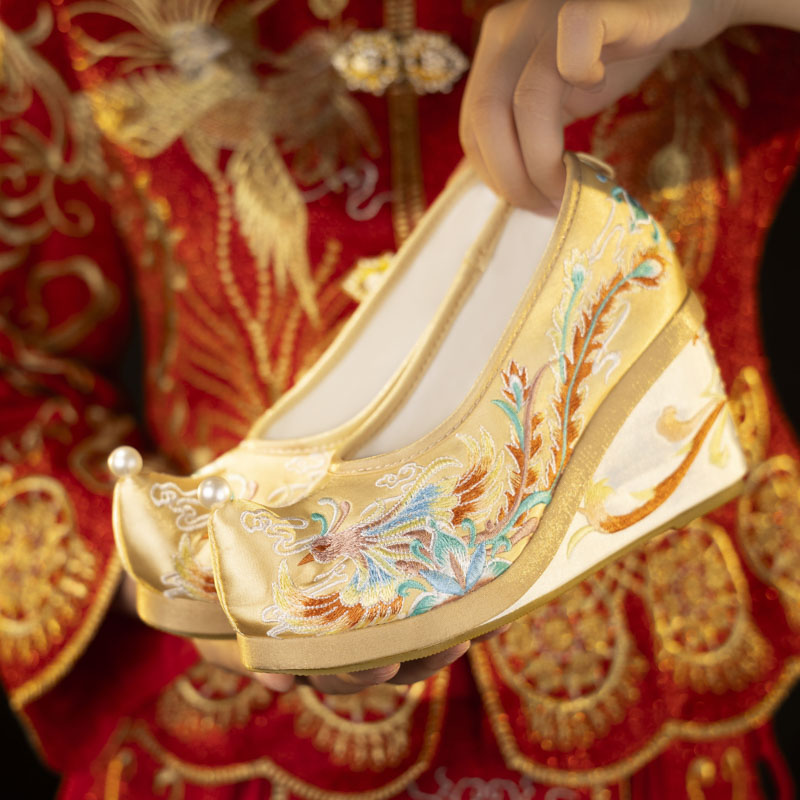 古风婚礼婚鞋女金色坡跟汉服鞋小个子增高翘头新娘鞋中式秀禾婚鞋