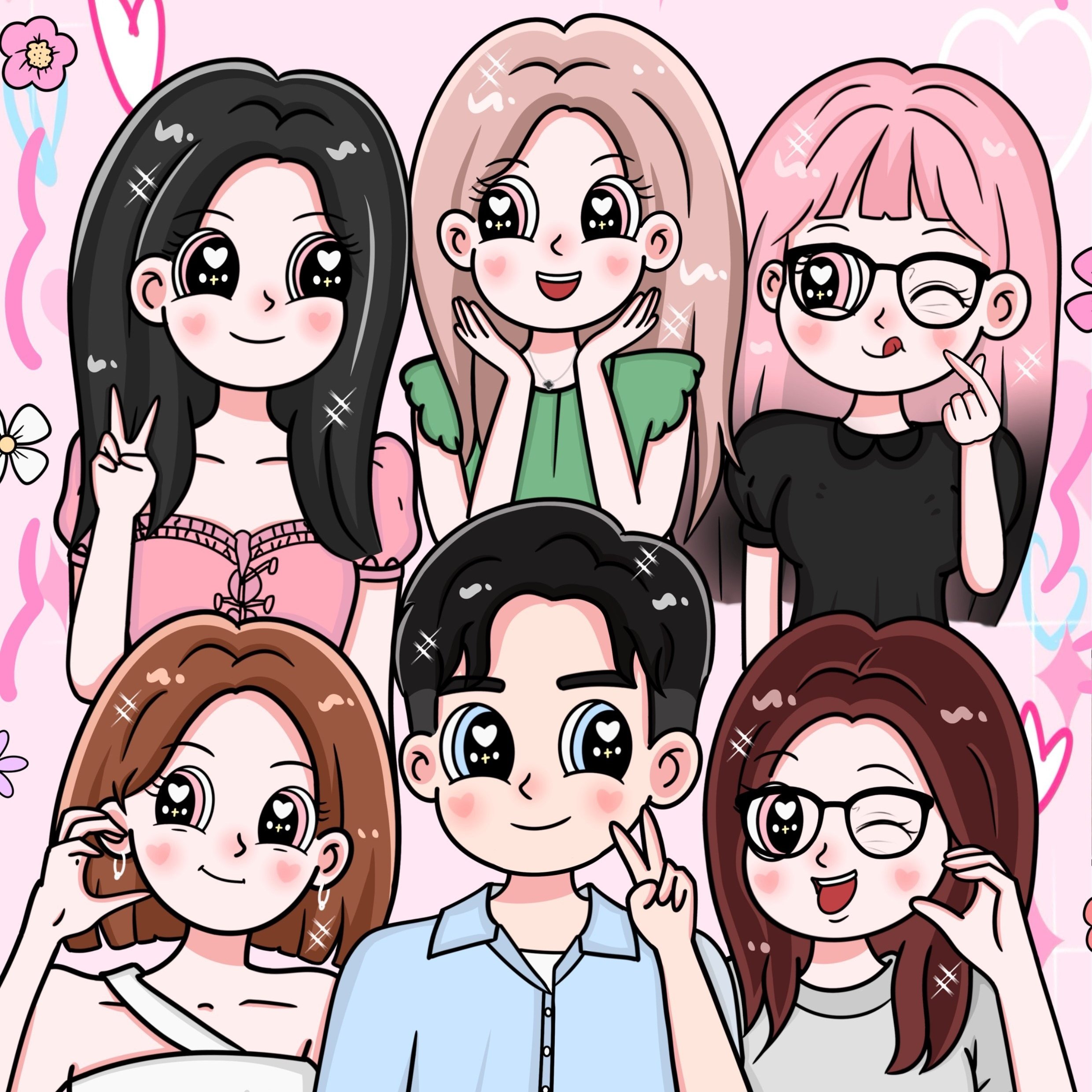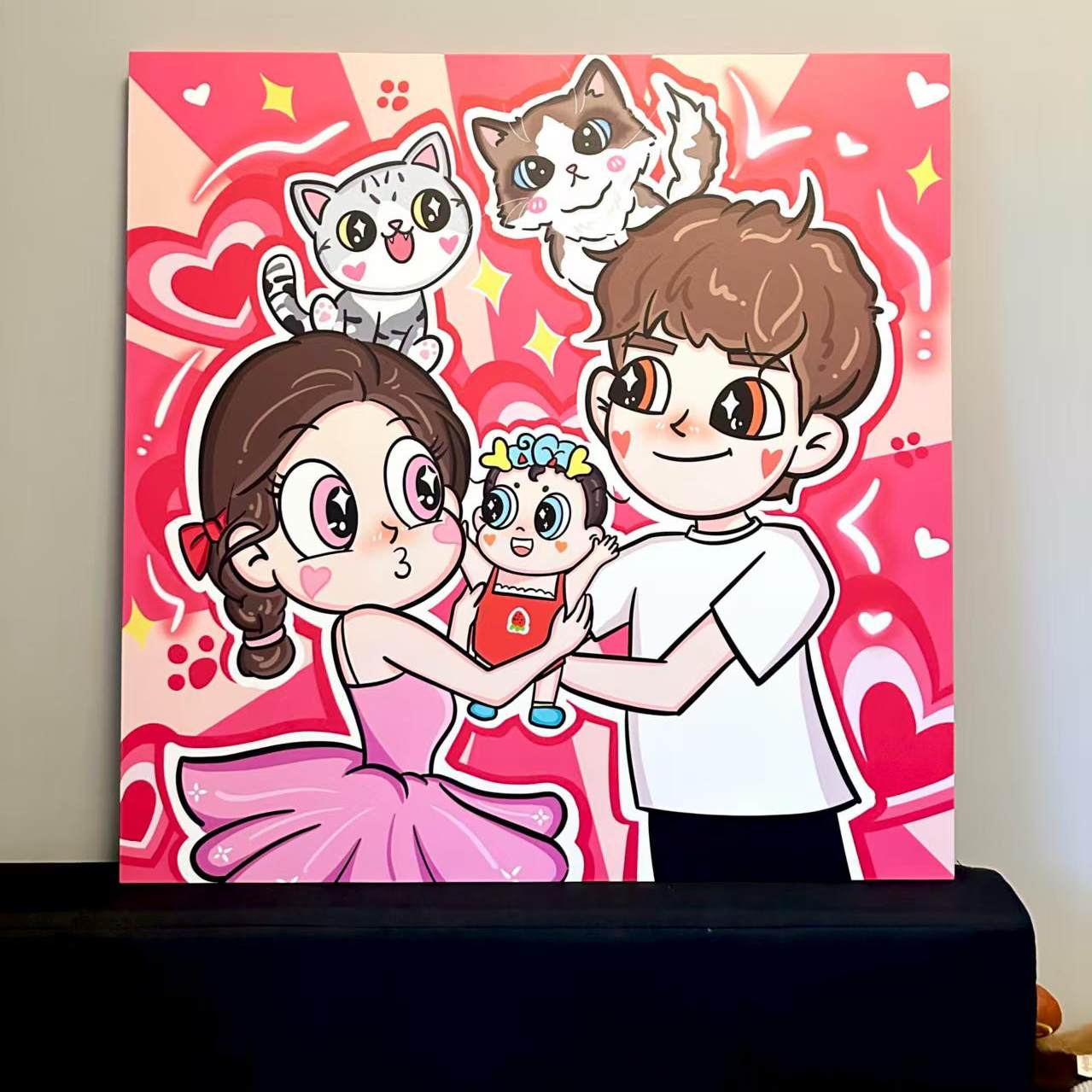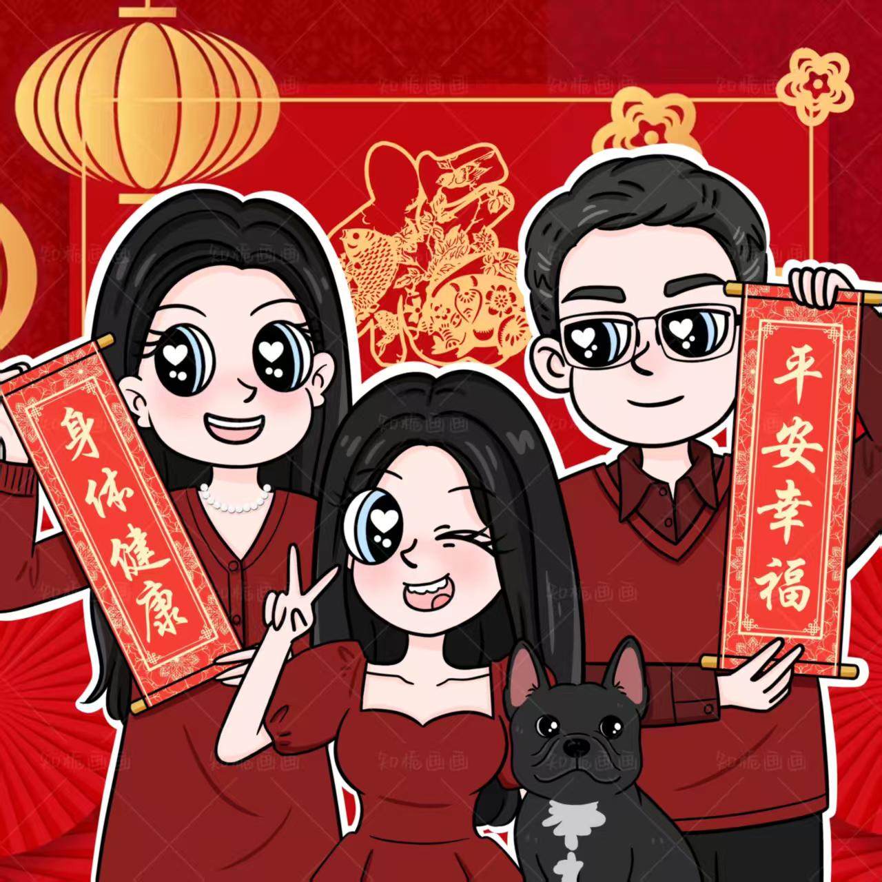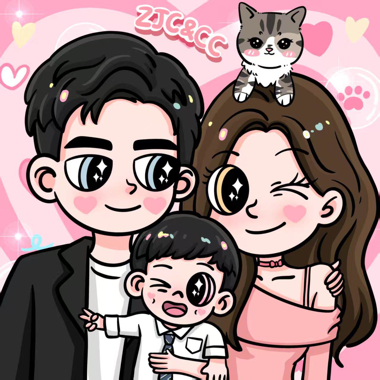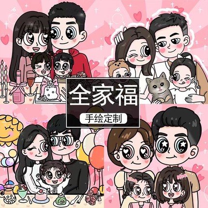 星蝶公主一家三四口手绘头像定制卡通全家福装饰画照片转Q版漫画