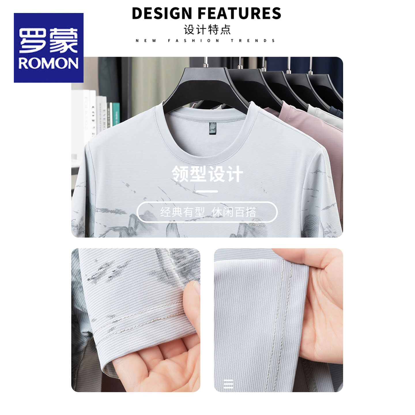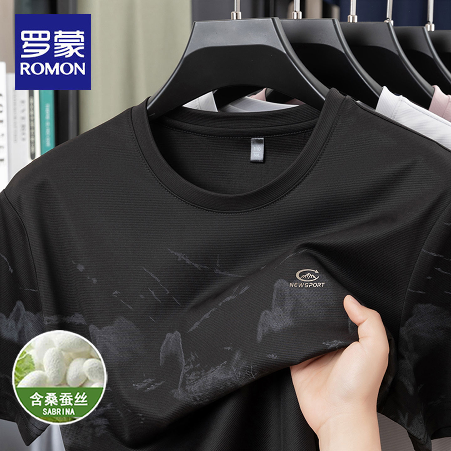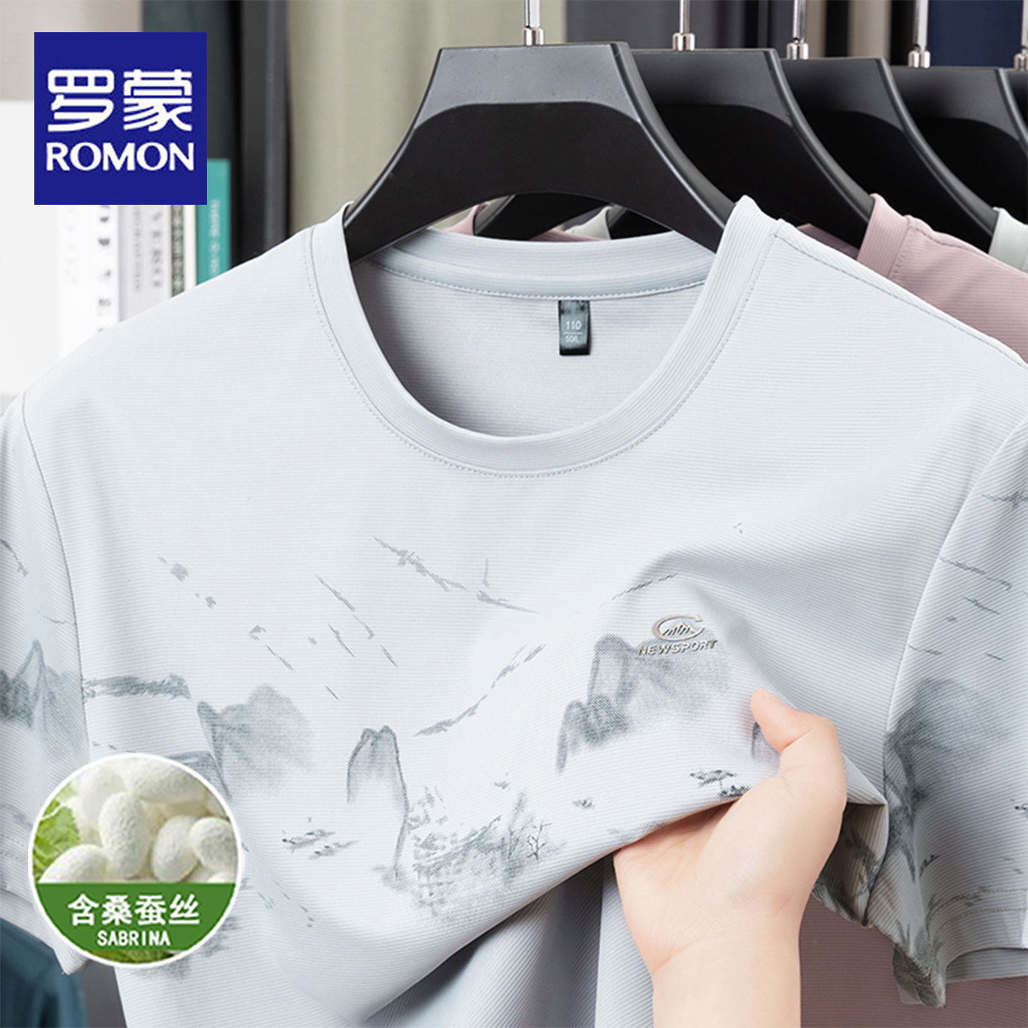 罗蒙桑蚕丝短袖T恤男士冰丝山水画夏季新款免烫无痕短袖体恤衫男