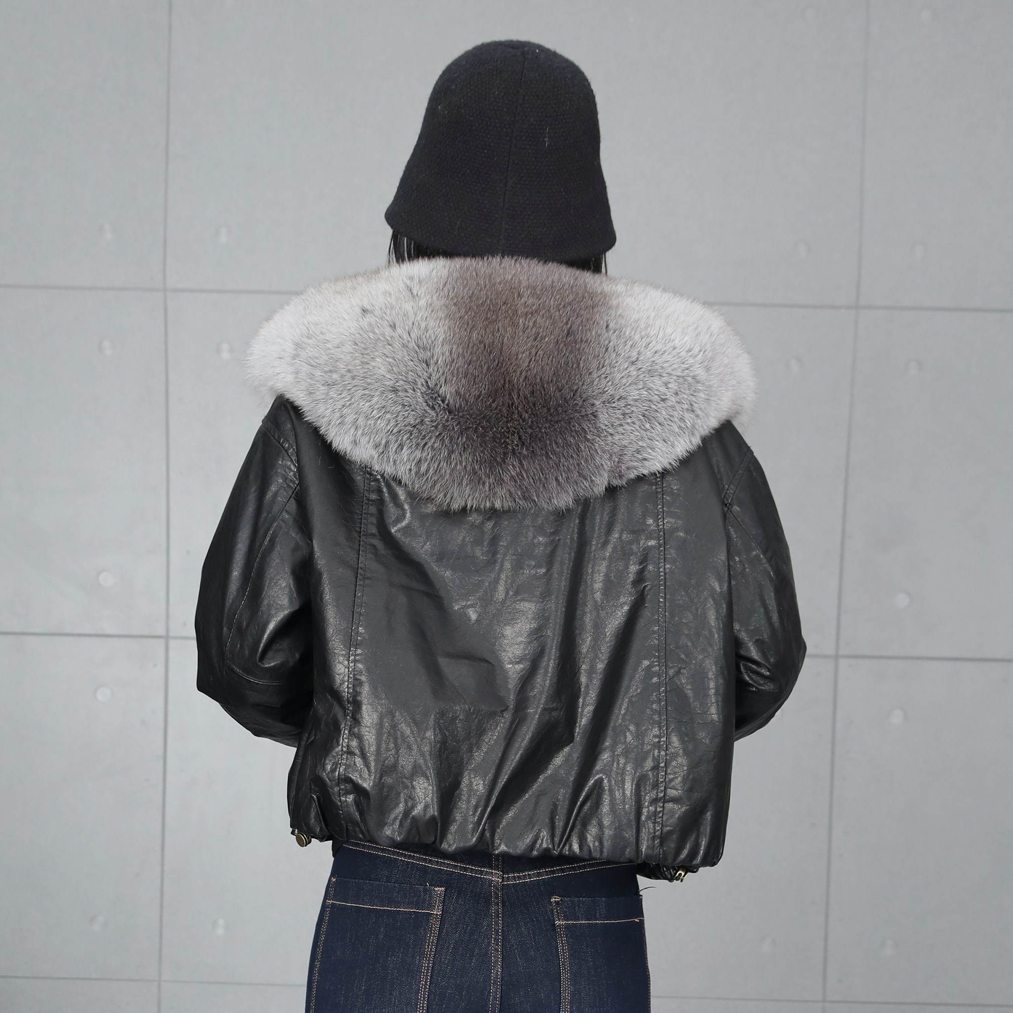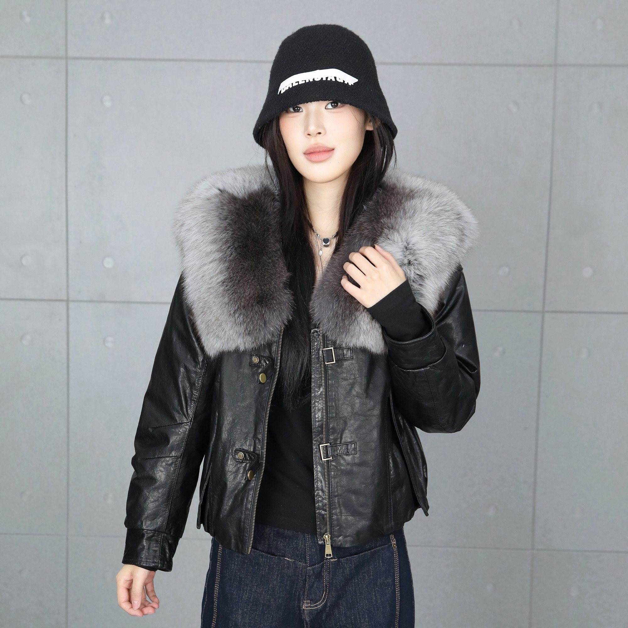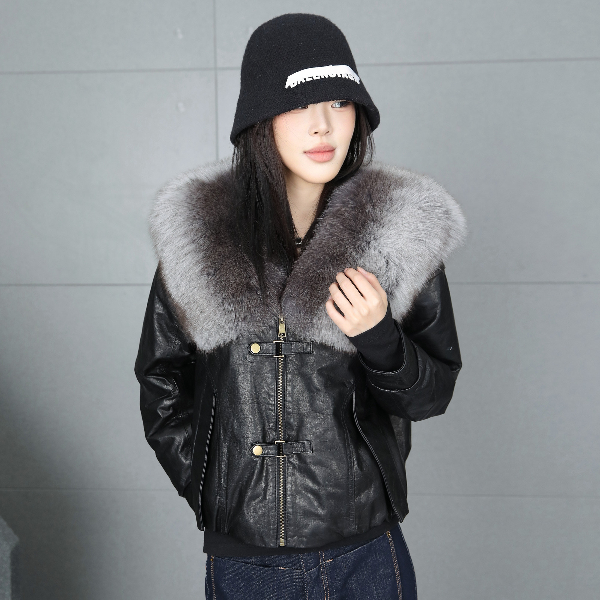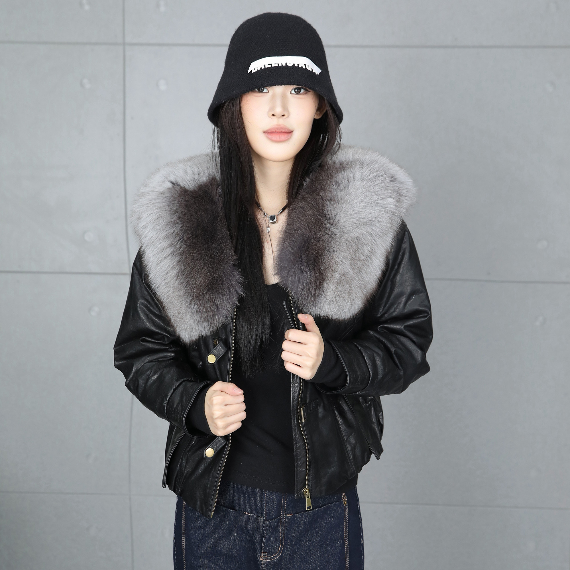 羽绒皮衣女短款2025年冬季新款狐狸毛领机车外套油蜡皮黑色皮夹克