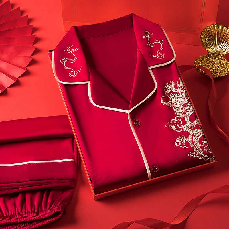 上海故事2025年新款夏季冰丝凉感情侣睡衣结婚喜庆刺绣女款家居服