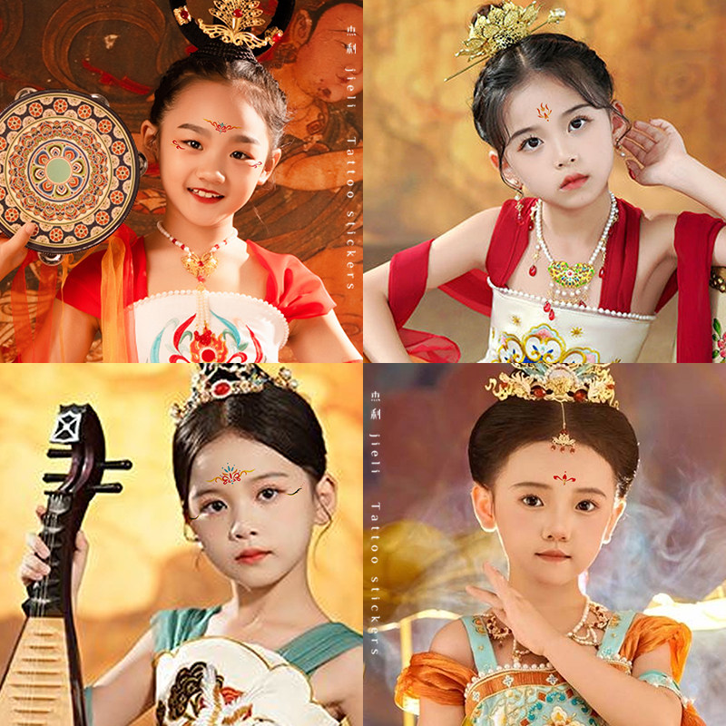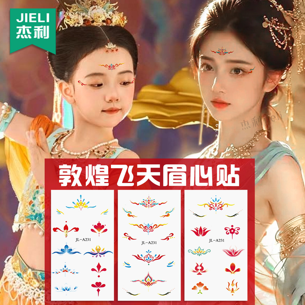 敦煌飞天汉服眉心贴花钿古装国风儿童可爱女孩额头贴纸印红心贴六一儿童节舞台表演化妆脸贴装饰眼妆纹身贴纸