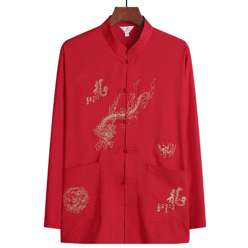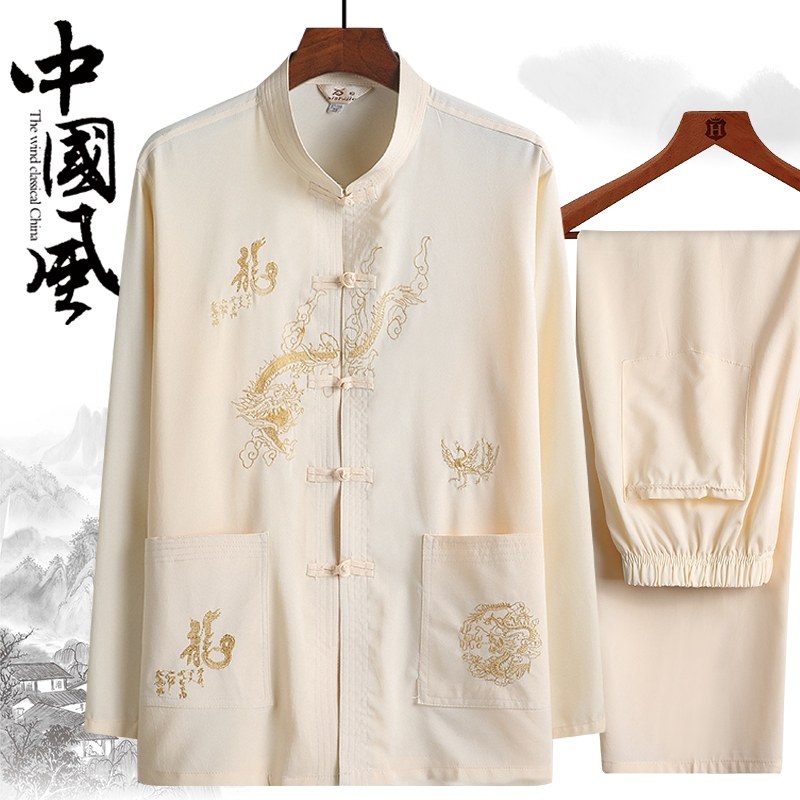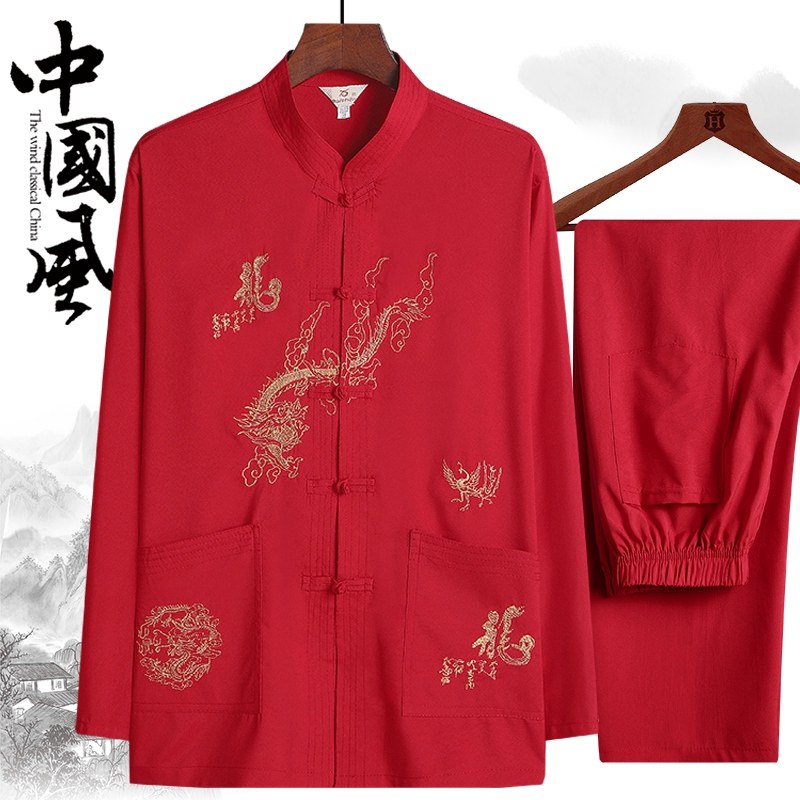 中老年人春秋爷爷唐装套装男士长袖衬衫中式刺绣爸爸晨练服汉服夏