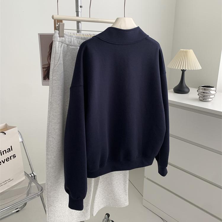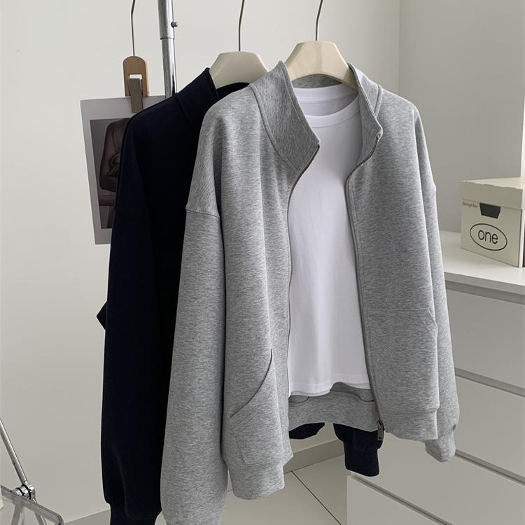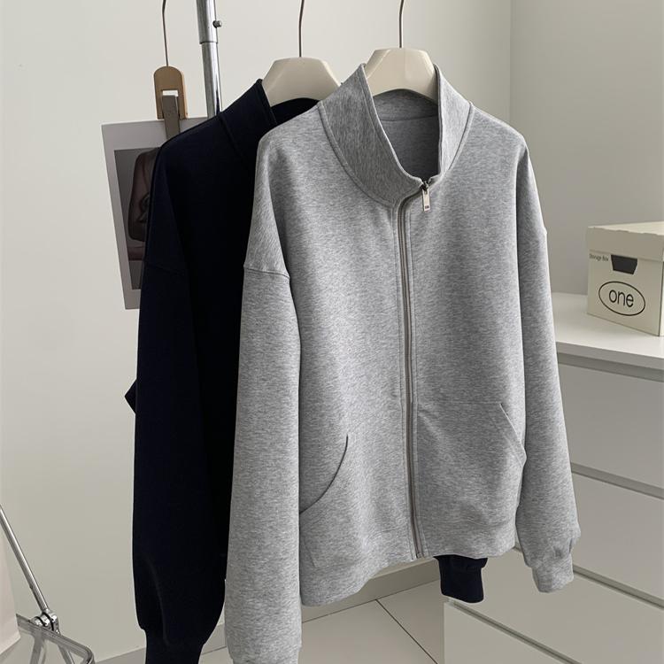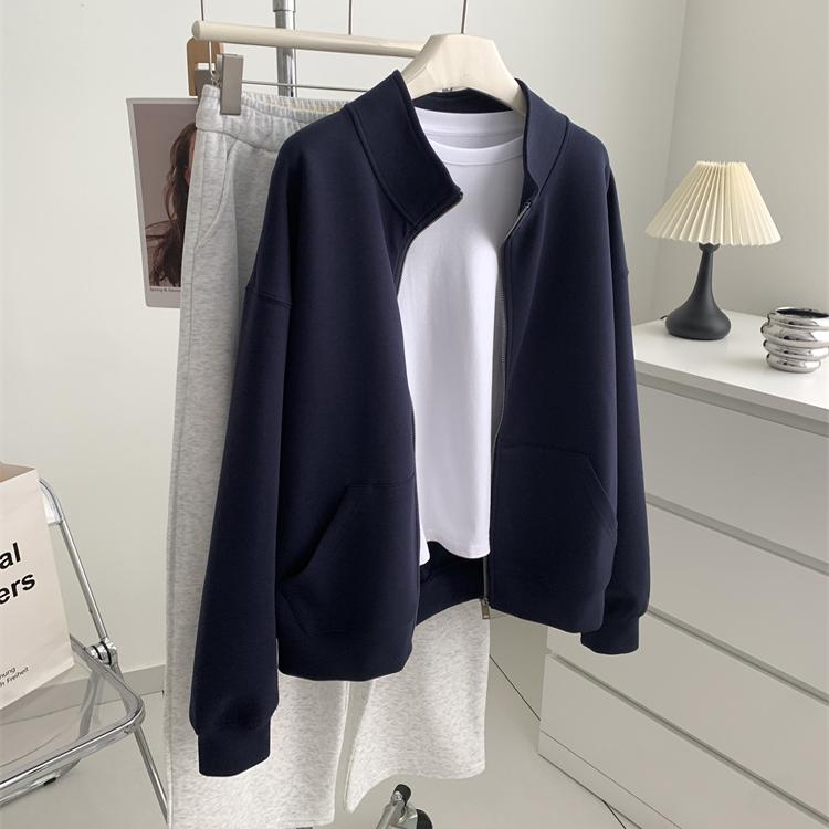 显白减龄藏青色立领外套女秋冬加绒宽松韩版气质百搭拉链纯色卫衣