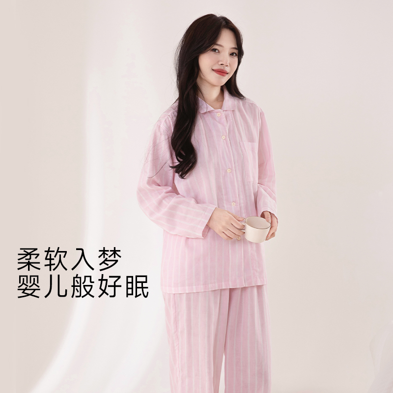 宜色家春夏2025新款睡衣女A类100%纯棉双层纱条纹情侣家居服套装