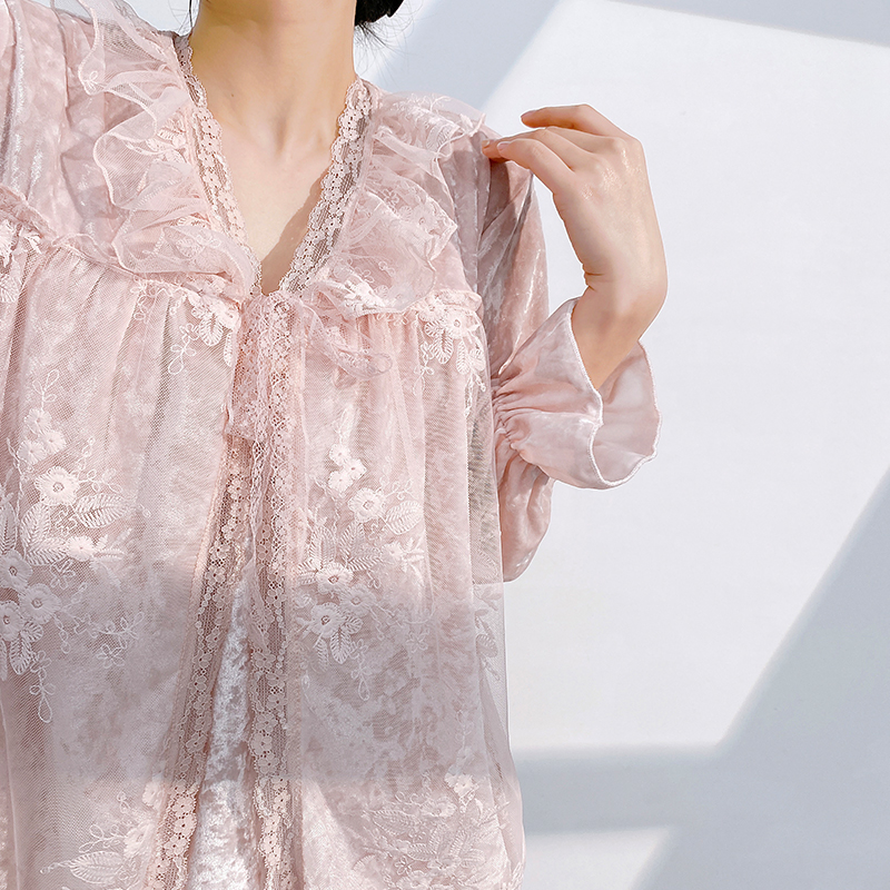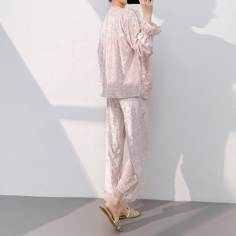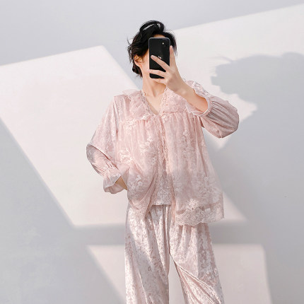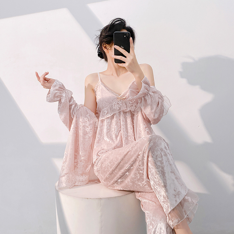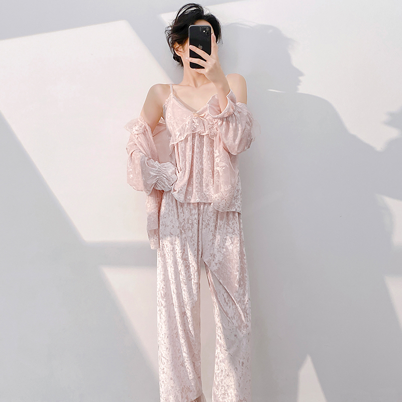 春秋性感金丝绒吊带睡衣女士三件套韩式蕾丝新款家居服套装钻石绒