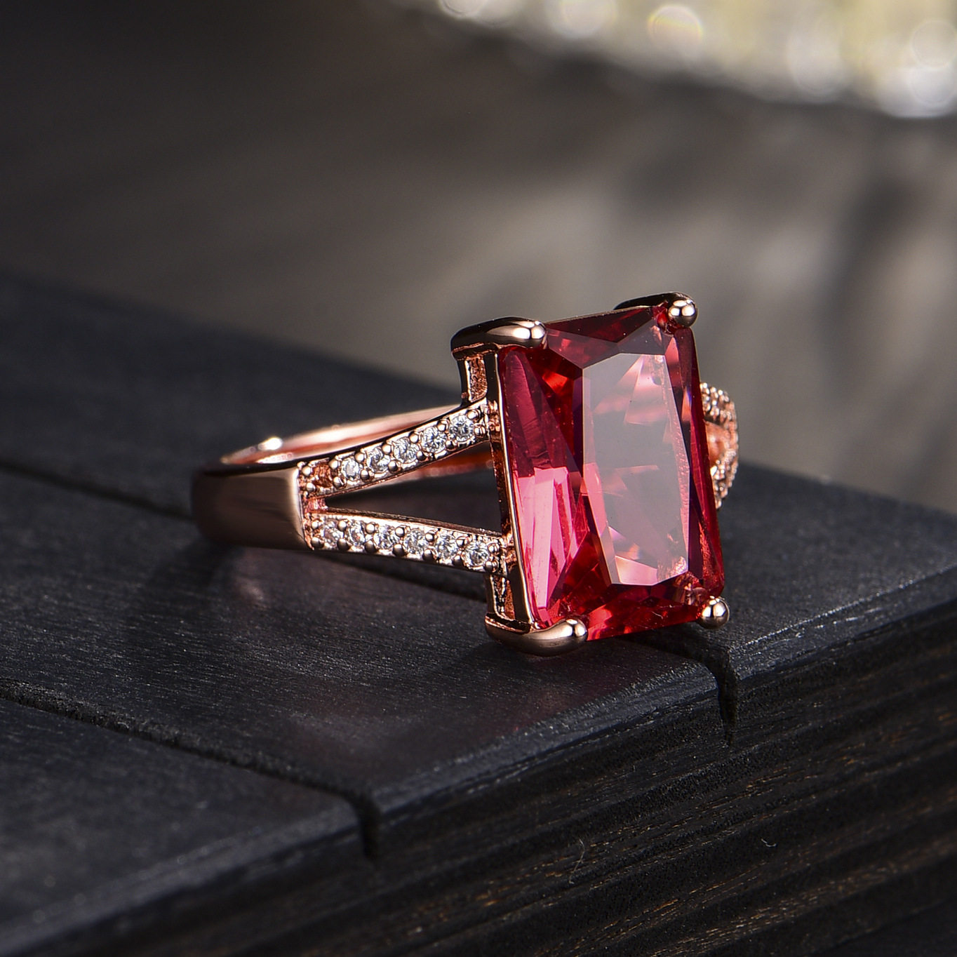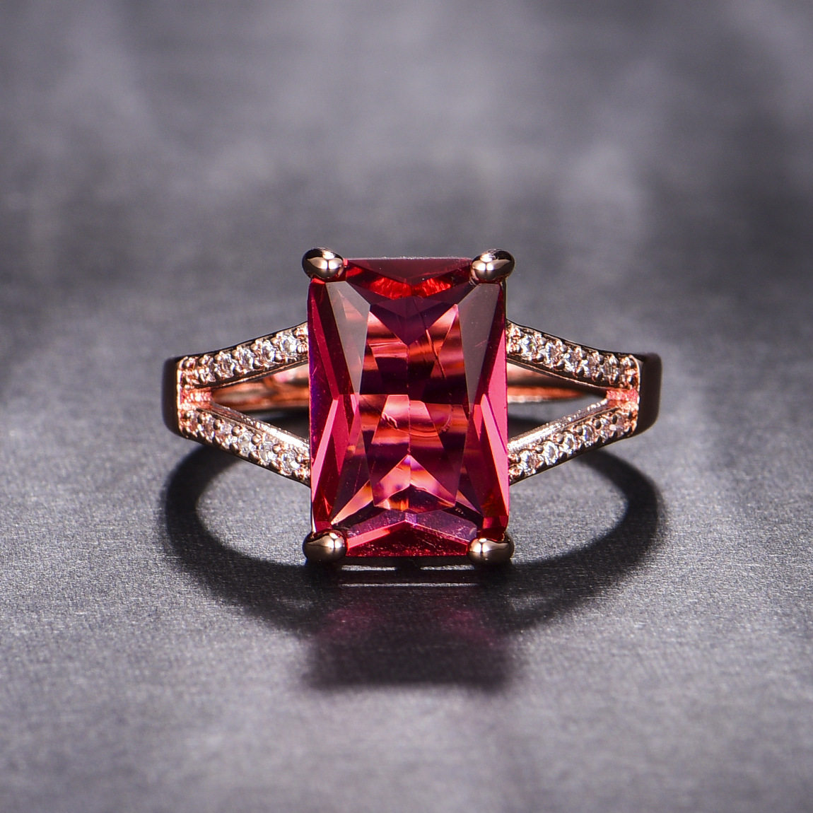 欧美气质长方形结婚钻戒少女仿真红碧玺甜美镀玫瑰金色镶钻戒指