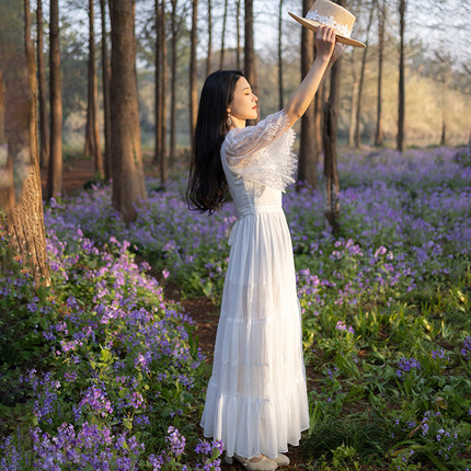 理想三旬女装法式复古度假风白色蕾丝仙女拼接大裙摆连衣裙长裙