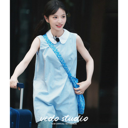 田曦薇同款法式娃娃领蓝色条纹迷你衬衫裙连衣裙无袖学院风短裙夏