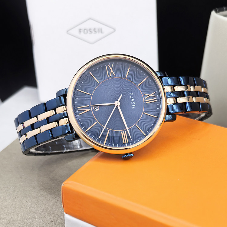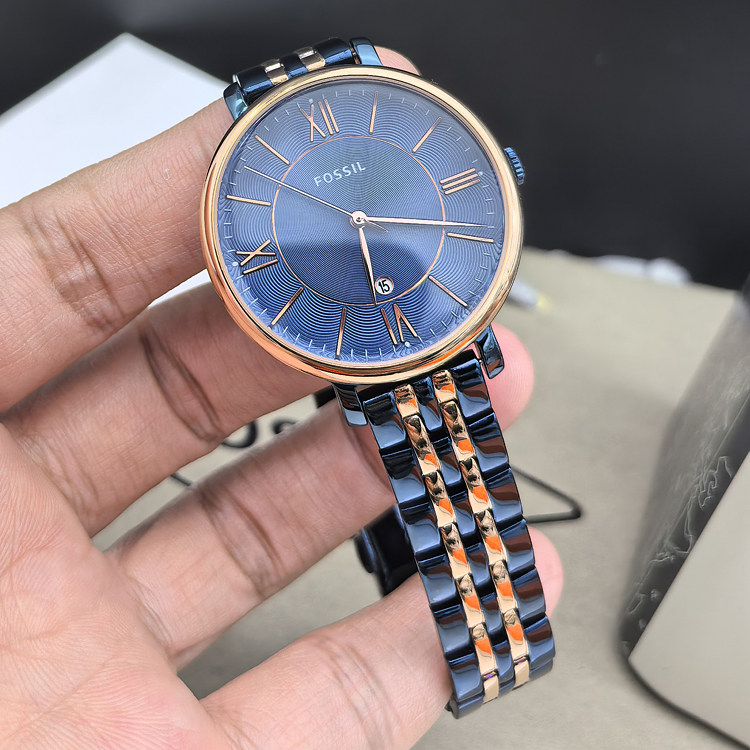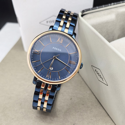 FOSSIL手表不锈钢蓝间玫瑰金简约日历罗玛刻度石英表休闲时尚女表