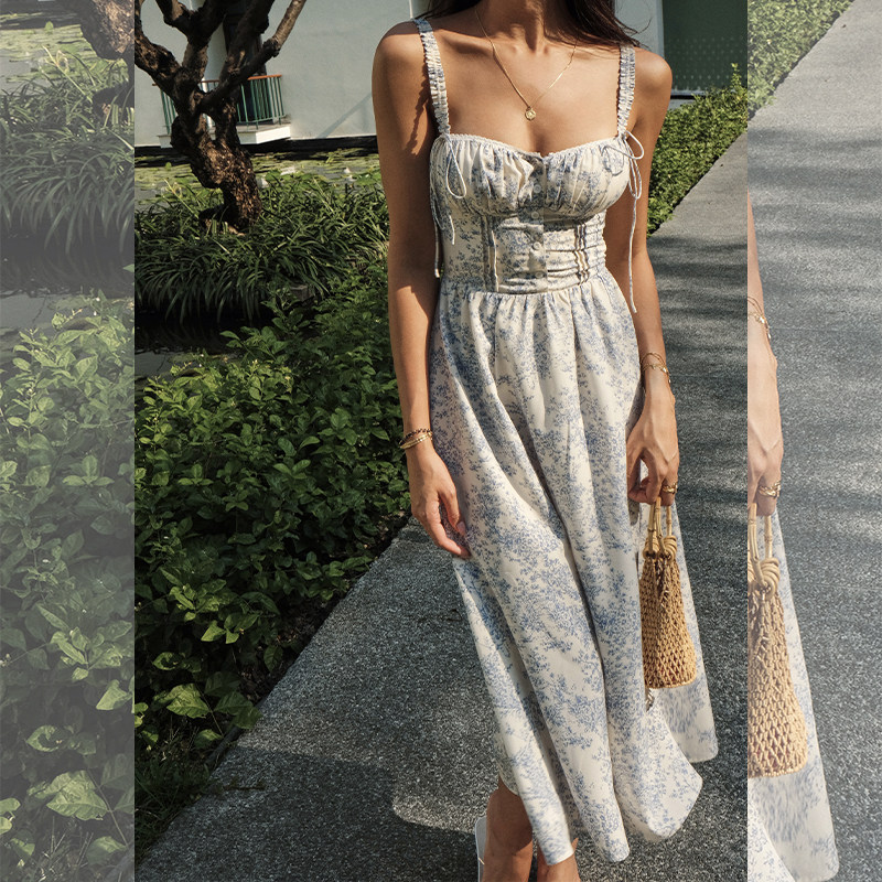 ITSNIKAR 法式气质蕾丝蓝色碎花连衣裙女海边度假吊带裙中长裙子