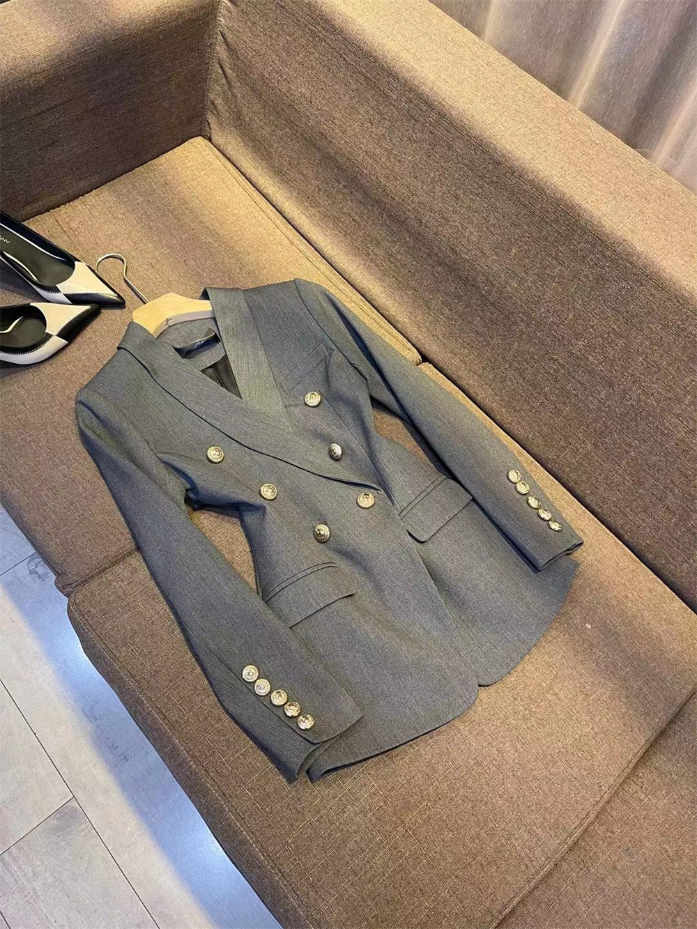 VANLU/高冷灰色调~金属浮雕纽扣系列~双排扣收腰西装+微喇裤套装