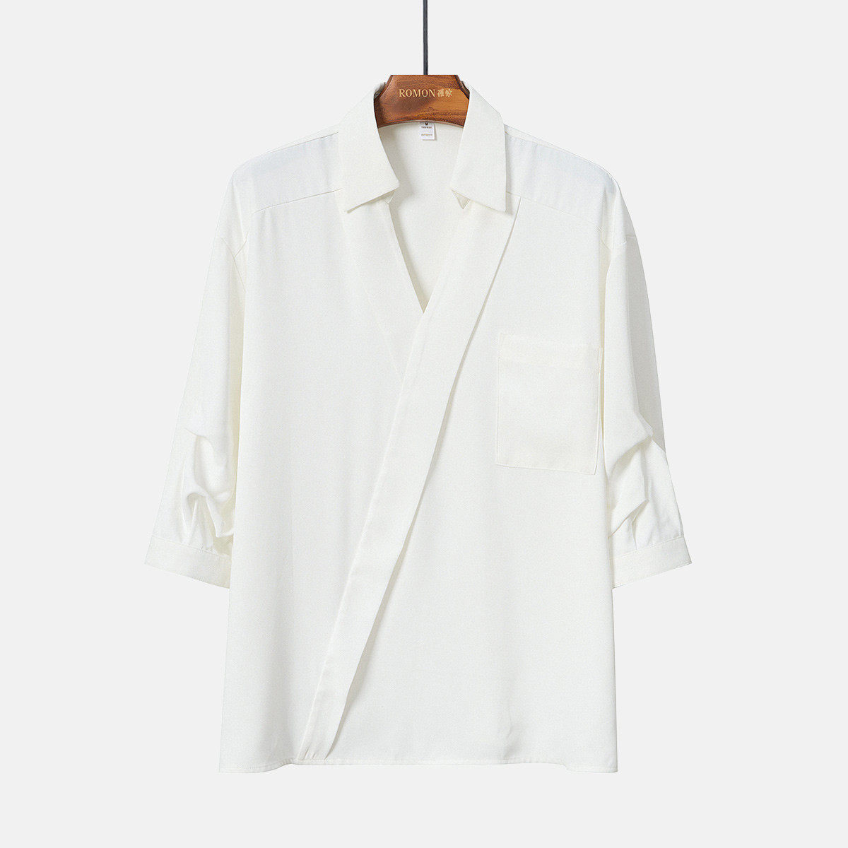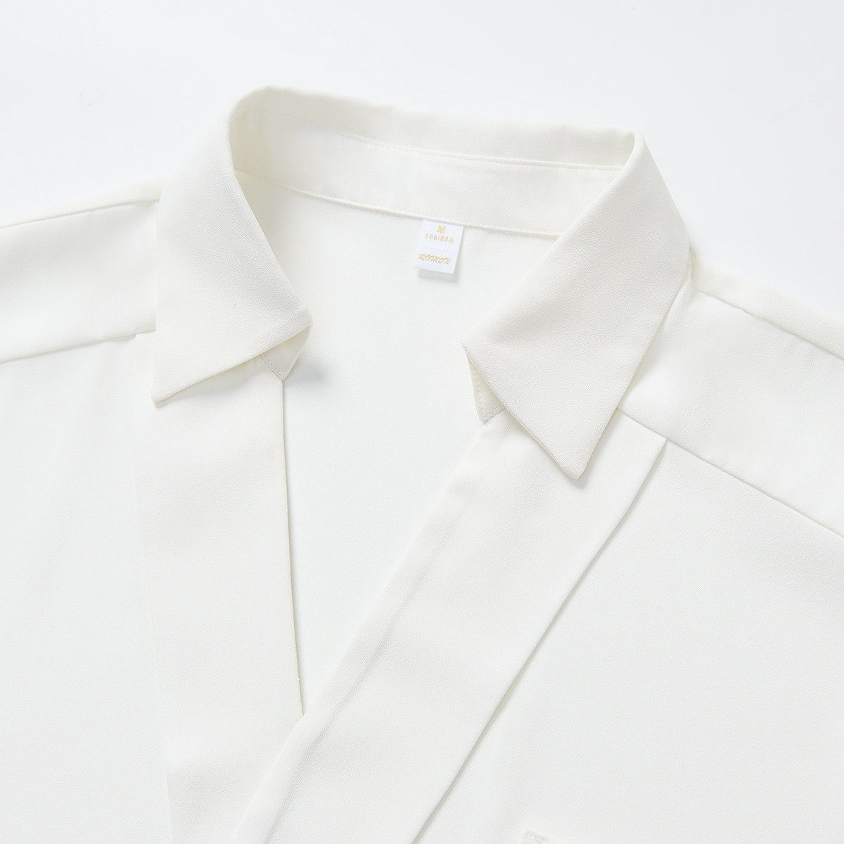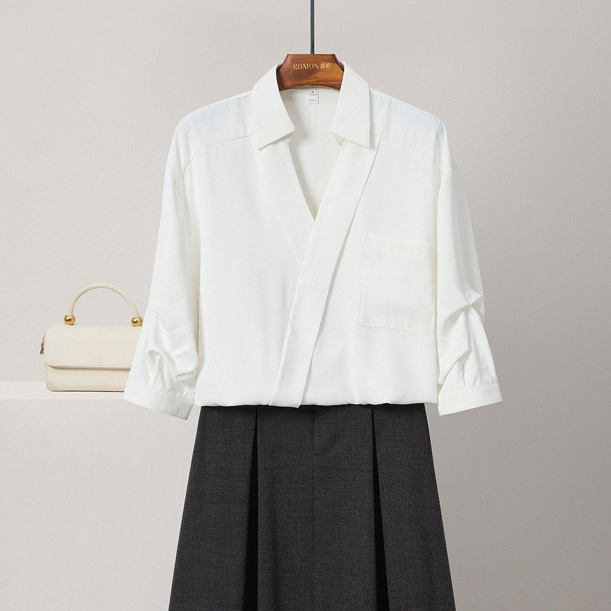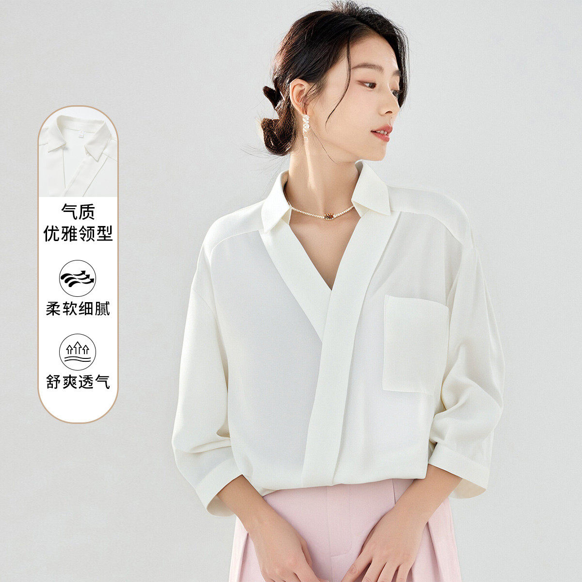罗蒙夏季七分袖衬衫女士休闲V领前胸口袋设计感短袖衬衣女上衣