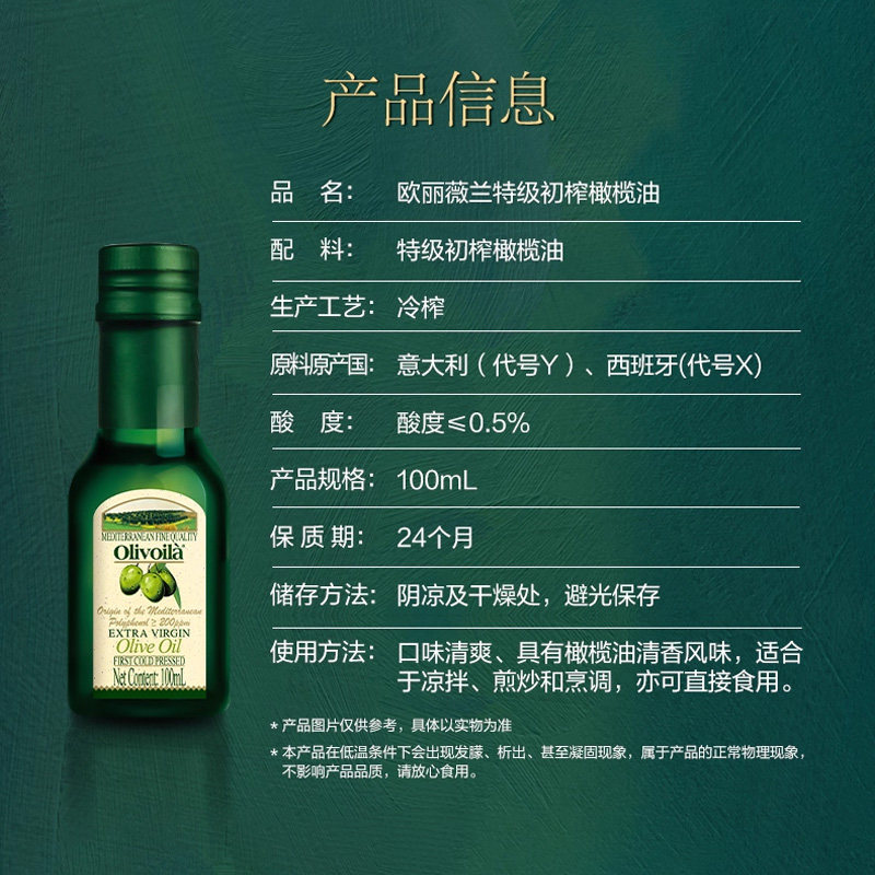 欧丽薇兰特级初榨橄榄油100ml/瓶冷食 凉拌 食用油西班牙原油进口