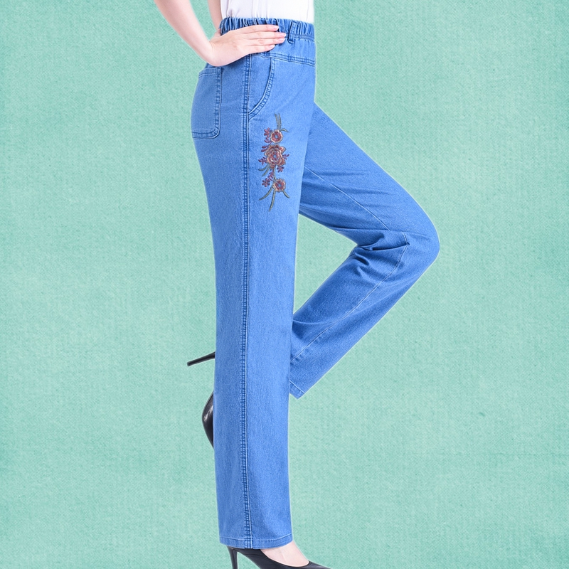 牛仔裤女长裤夏季薄款松紧腰高腰大码弹力棉布中老年妈妈直筒裤子