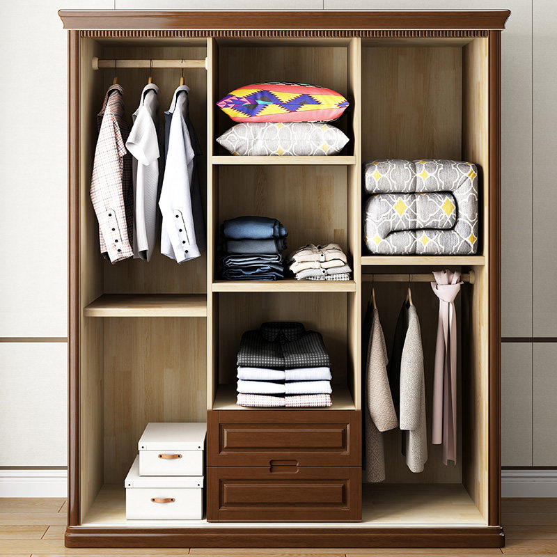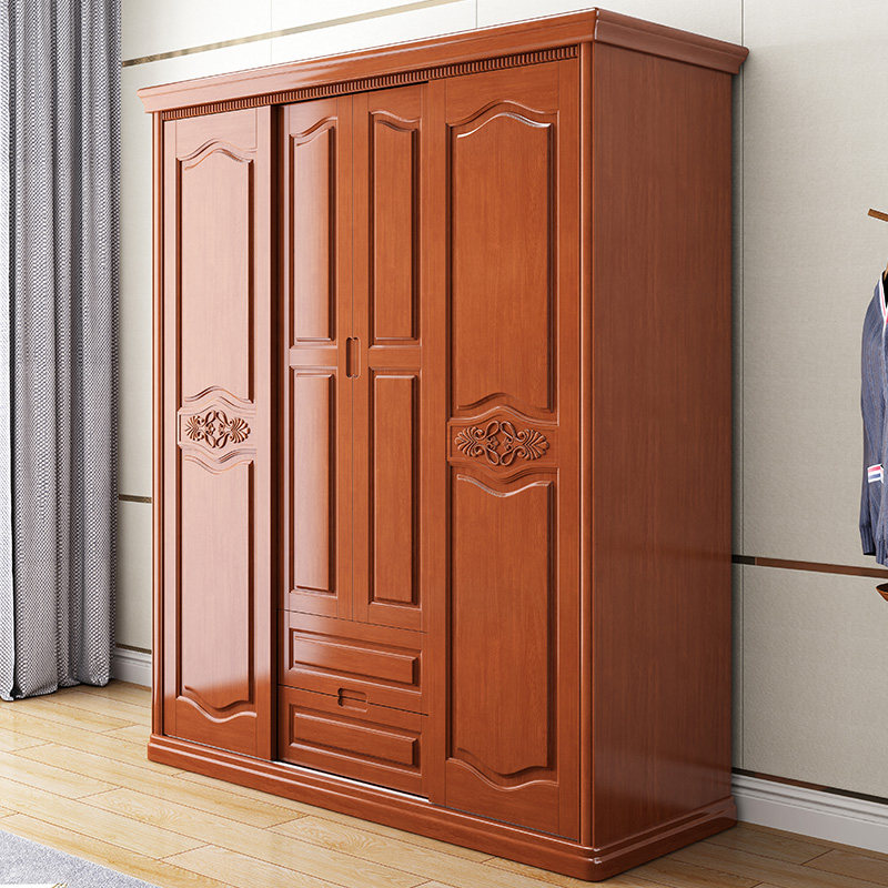 简约现代新中式实木四门衣柜卧室推拉门滑移门经济实用整体衣橱