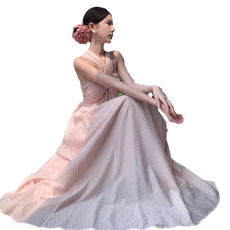 纯欲高级气质粉色连衣裙女夏季度假风小众设计感挂脖度假吊带长裙