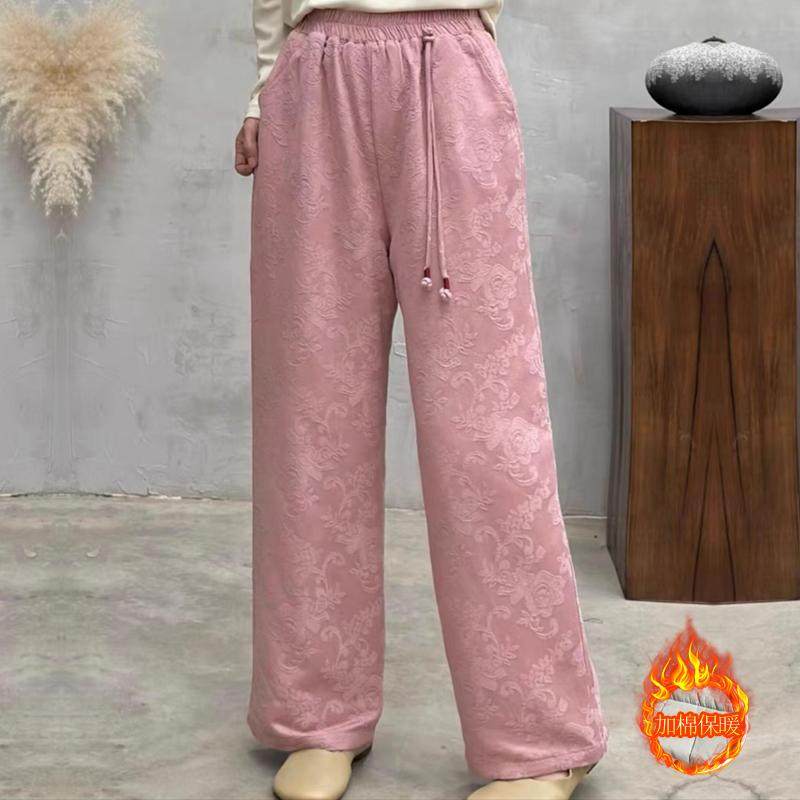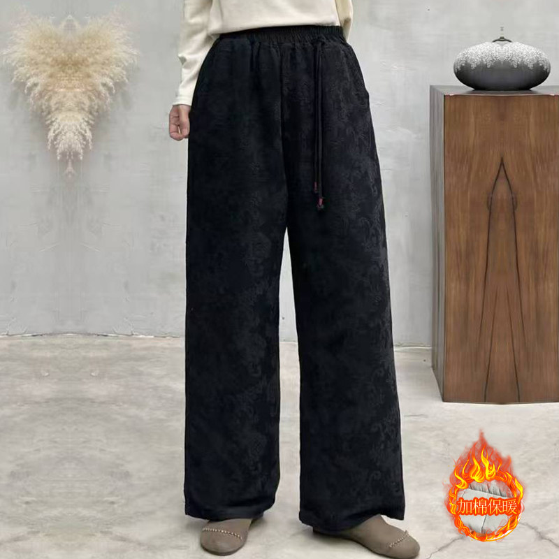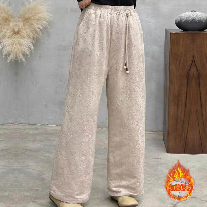 新中式加棉加厚保暖提花棉麻阔腿裤女宽松垂感显瘦直筒休闲裤棉裤