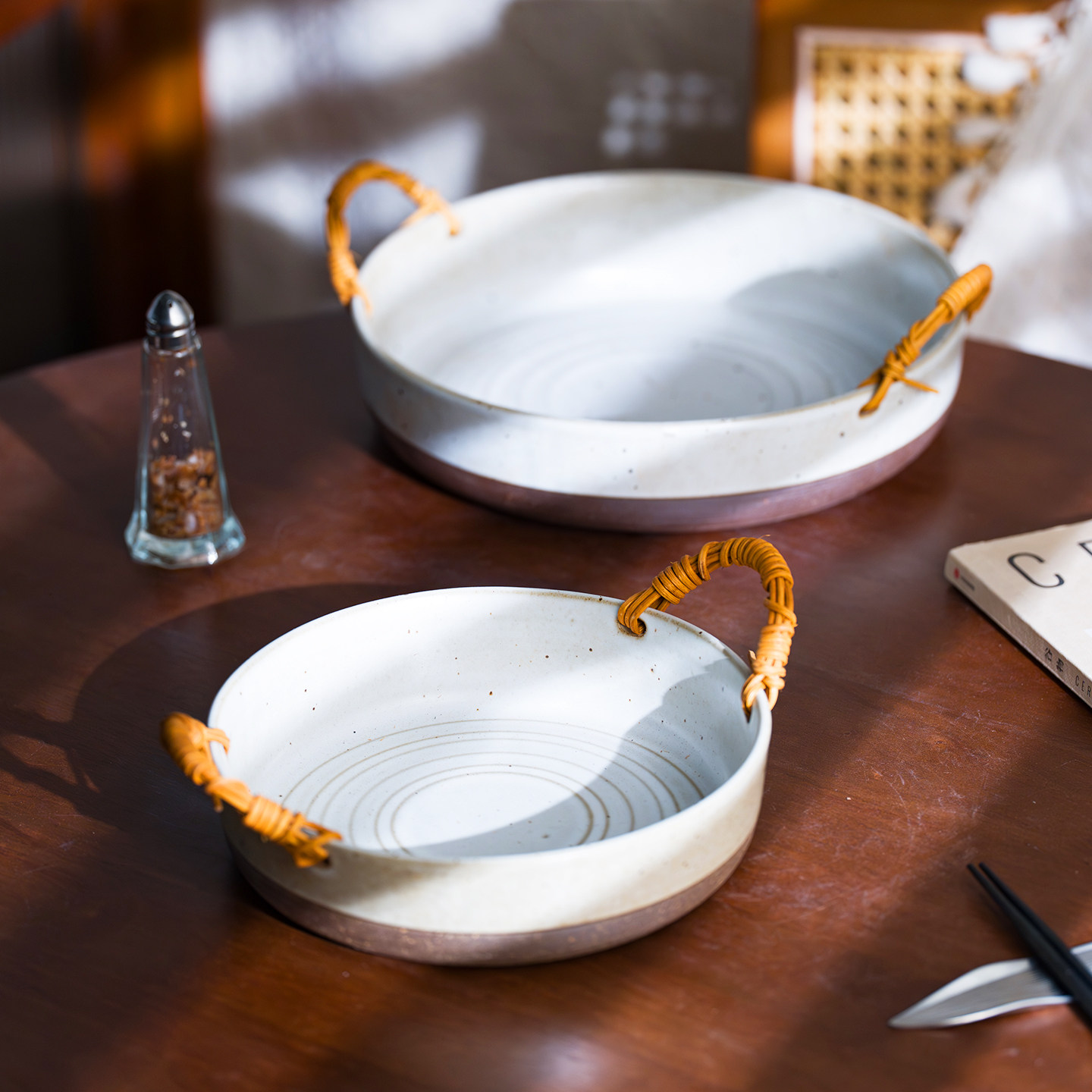 日式粗陶双耳提绳深盘汤盘
