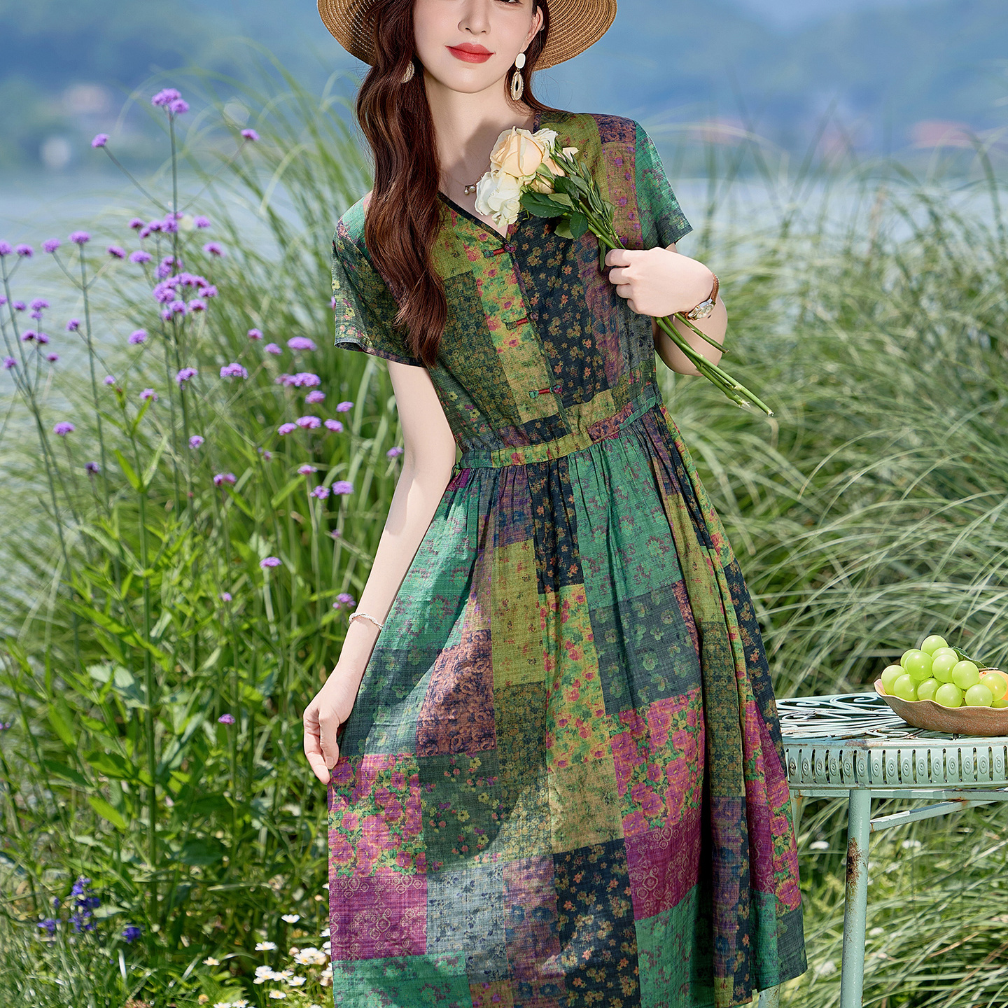 素雅订制女装原创品牌夏季新款短袖气质V领印花减龄棉麻连衣裙女