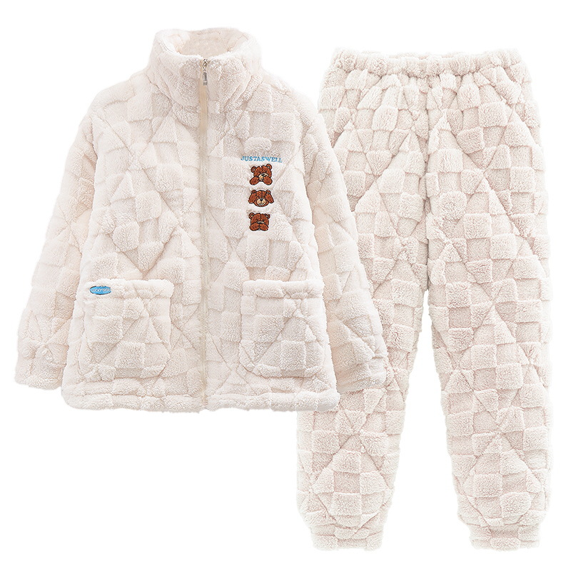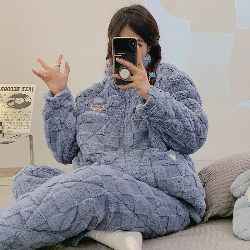 秋冬季新款珊瑚绒睡衣女三层夹棉加厚保暖法兰绒家居服可外穿