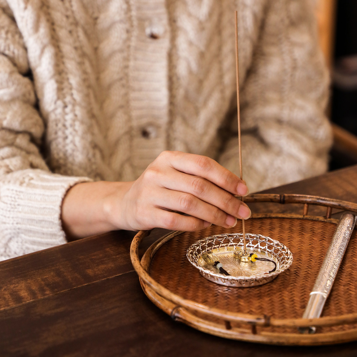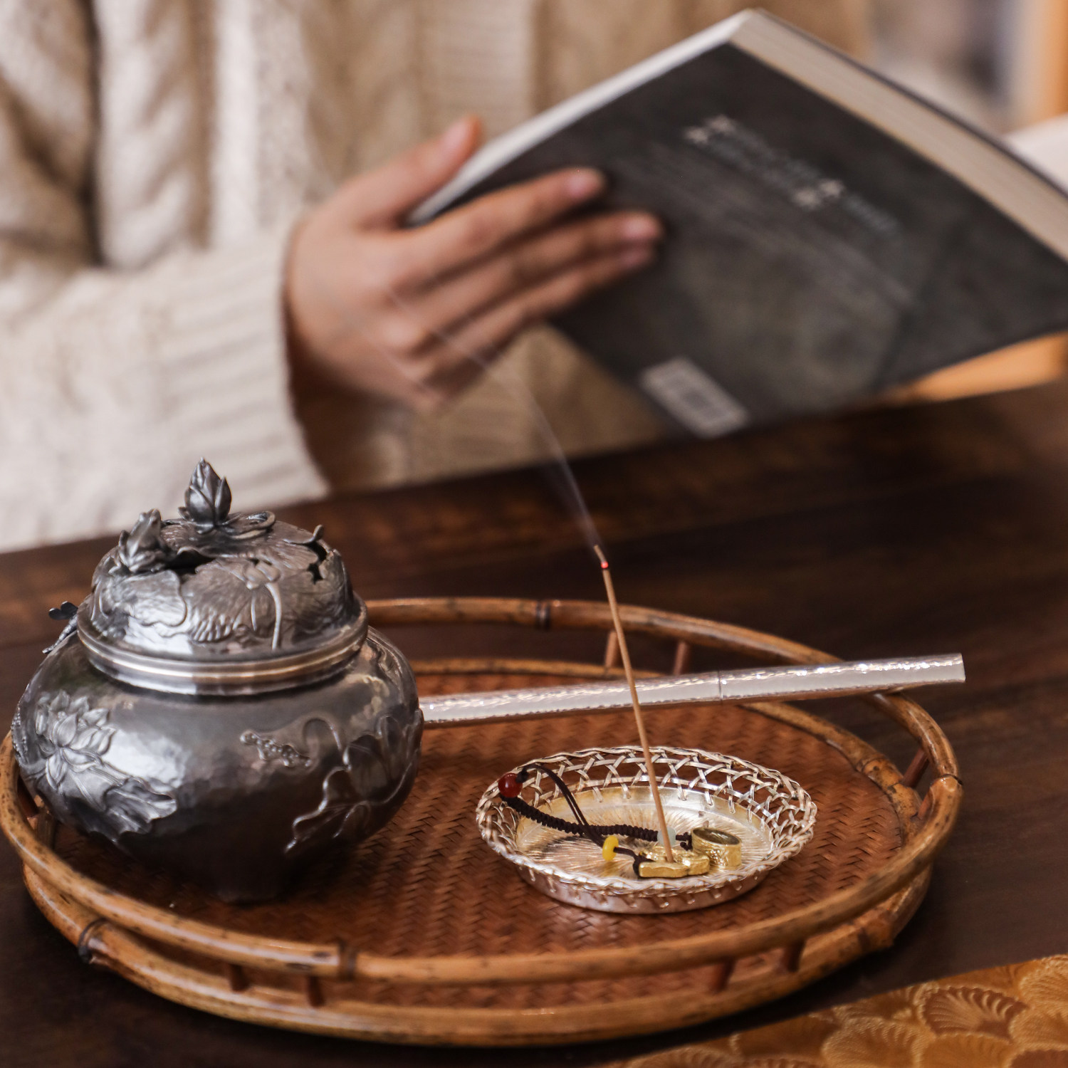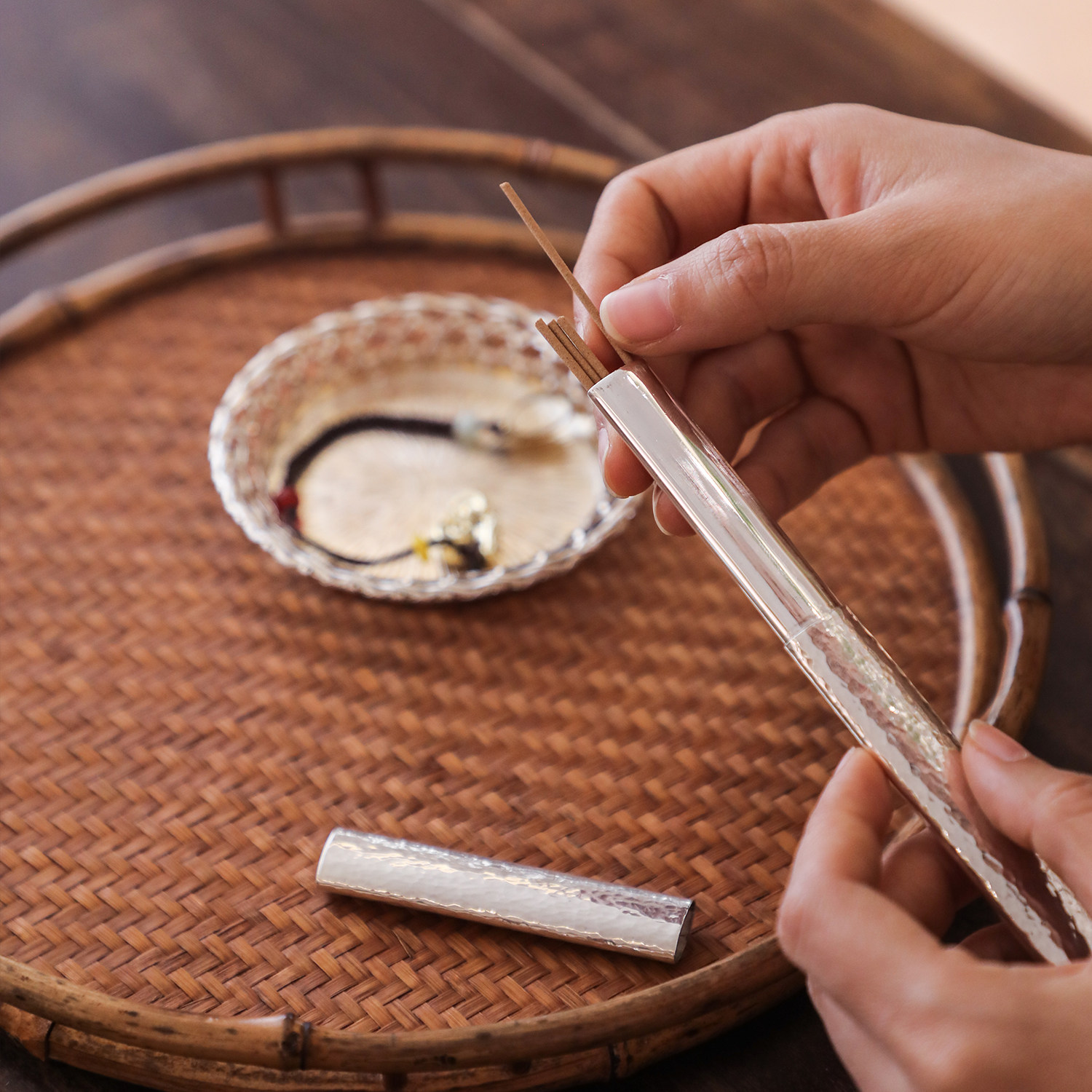 纯银时代 伴月香筒足银999手工锤纹线香沉香檀香储香器便携香道具