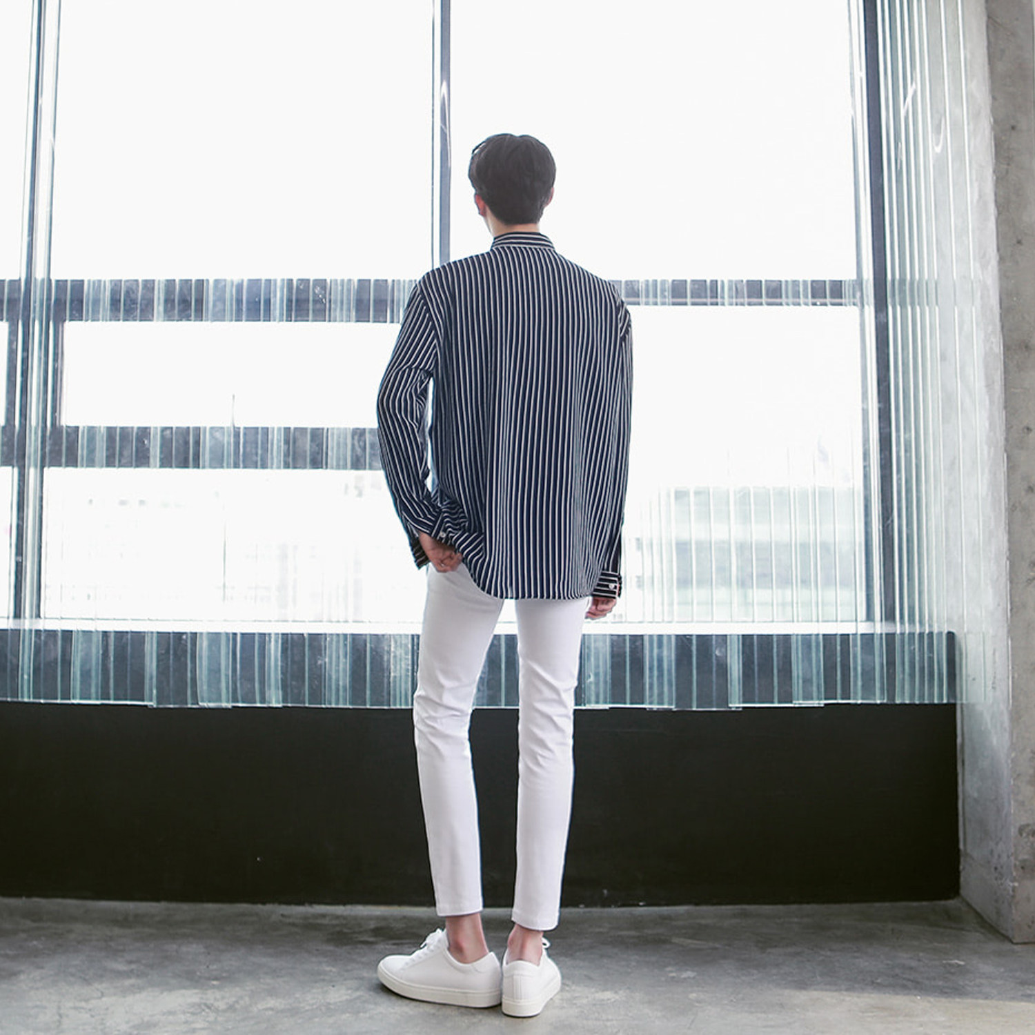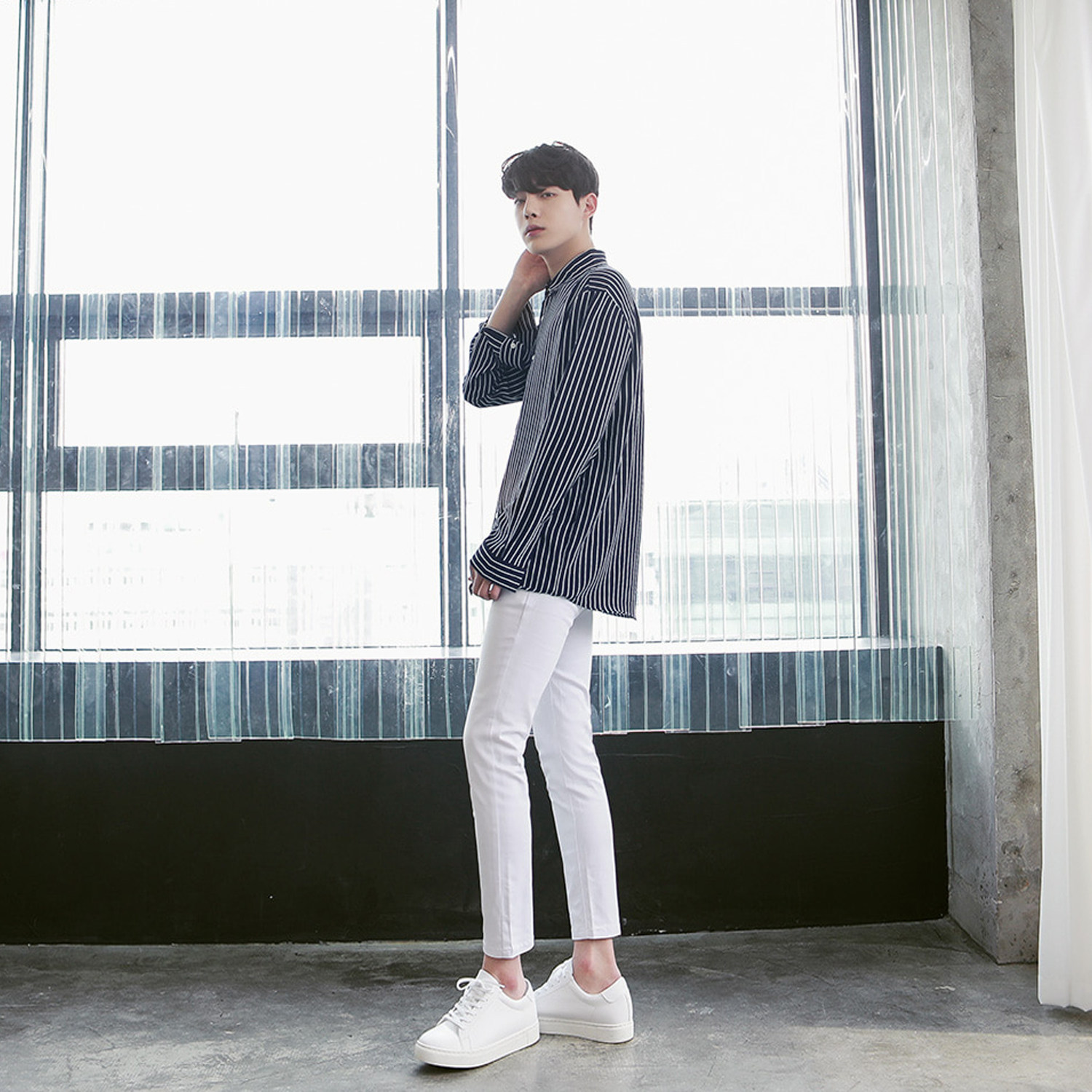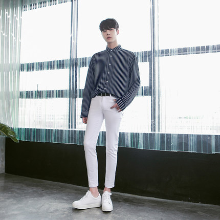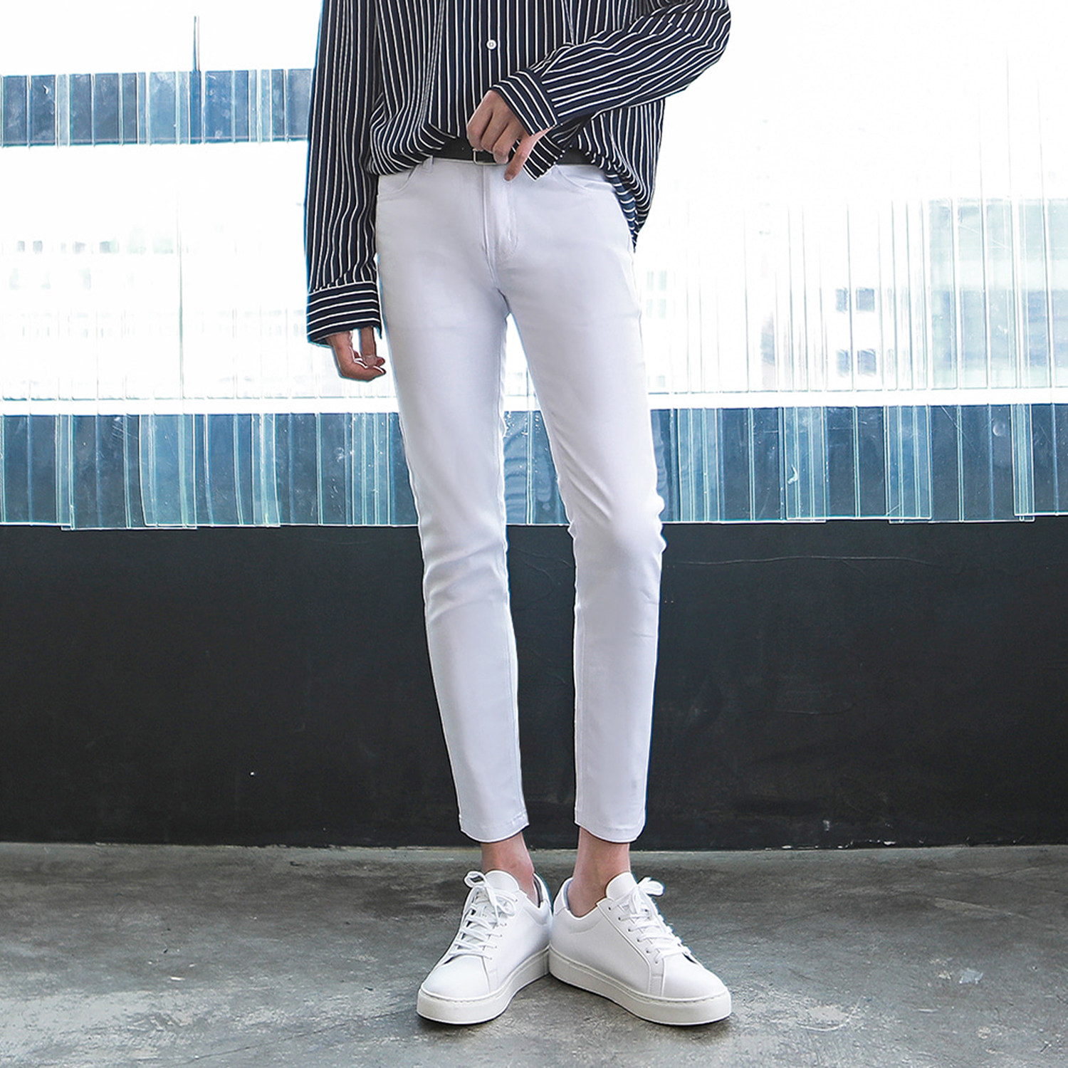 高端极简白色九分修身男士牛仔裤