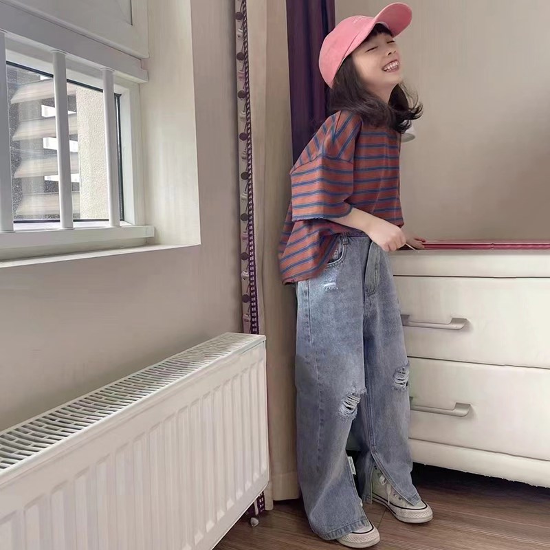 韩国童装男童女童条纹T恤2024夏装儿童短袖拼色t中大童宽松上衣潮