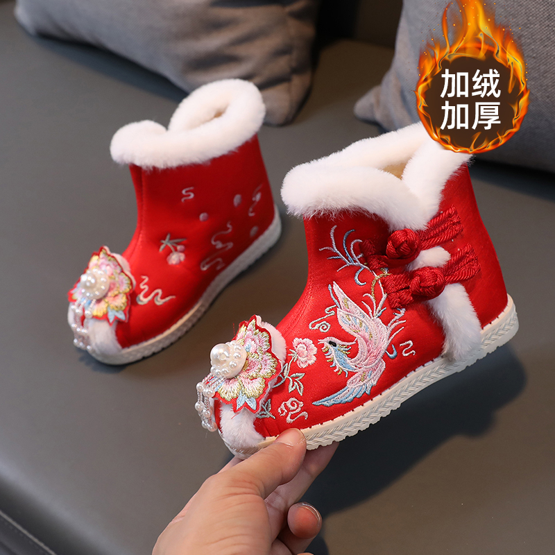 儿童汉服鞋子女童秋冬季加绒绣花鞋马面裙国风棉鞋古装拜年虎头鞋