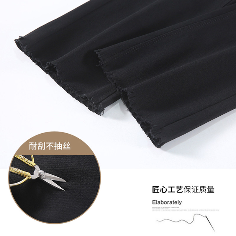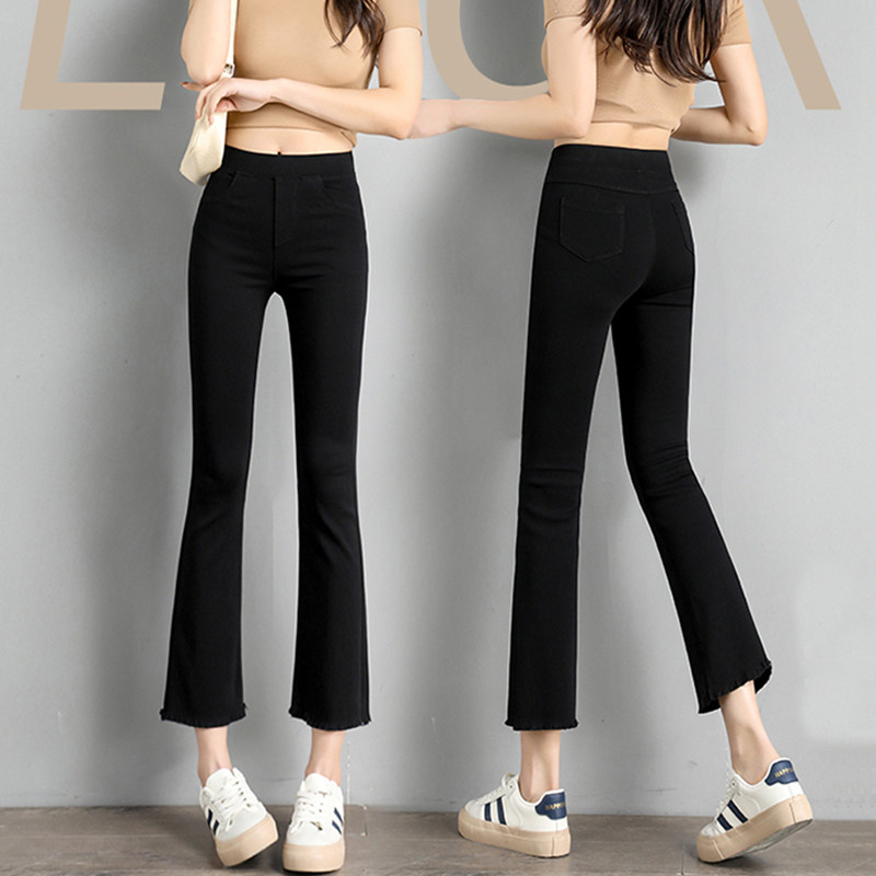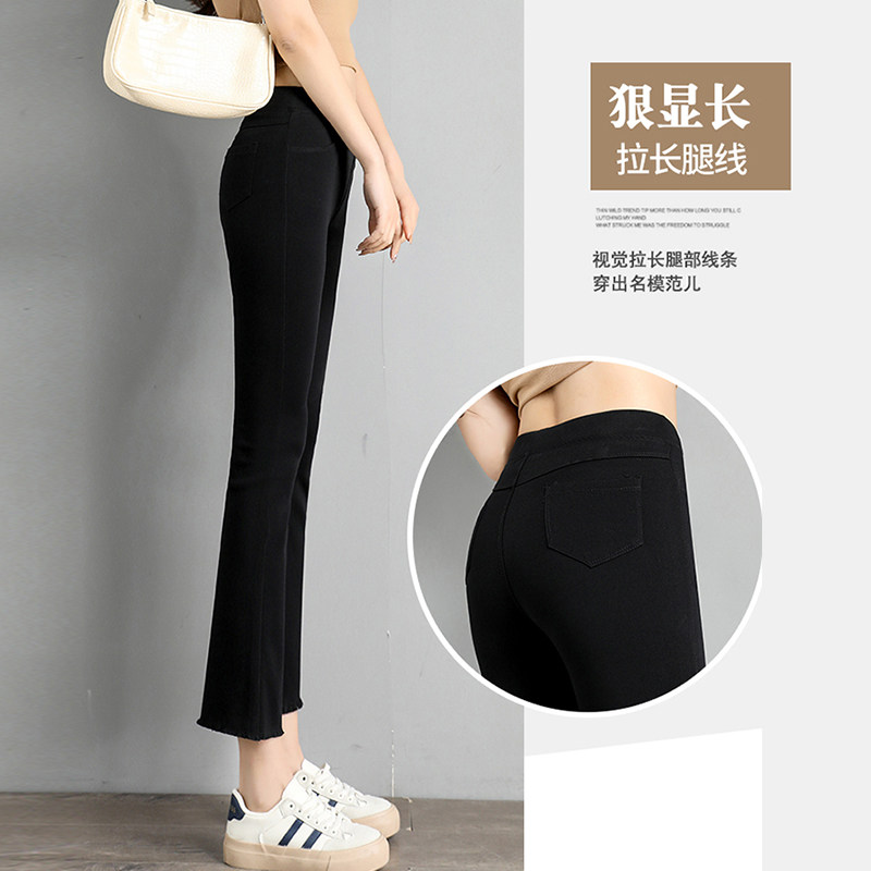 松紧腰头喇叭裤女小个子八分毛边裤显瘦百搭弹力裤九分微喇小黑裤