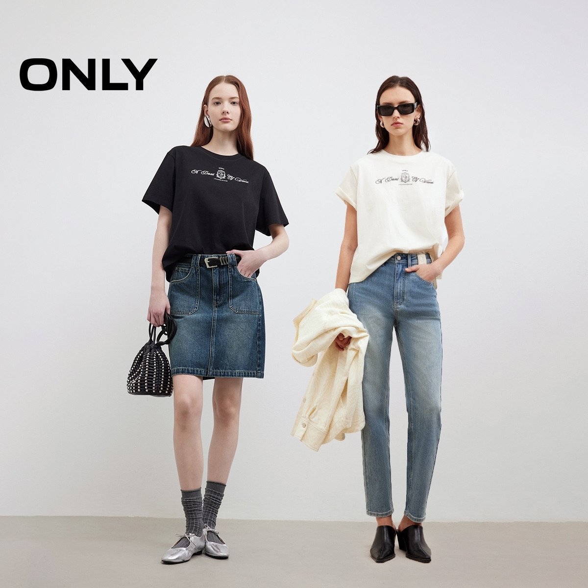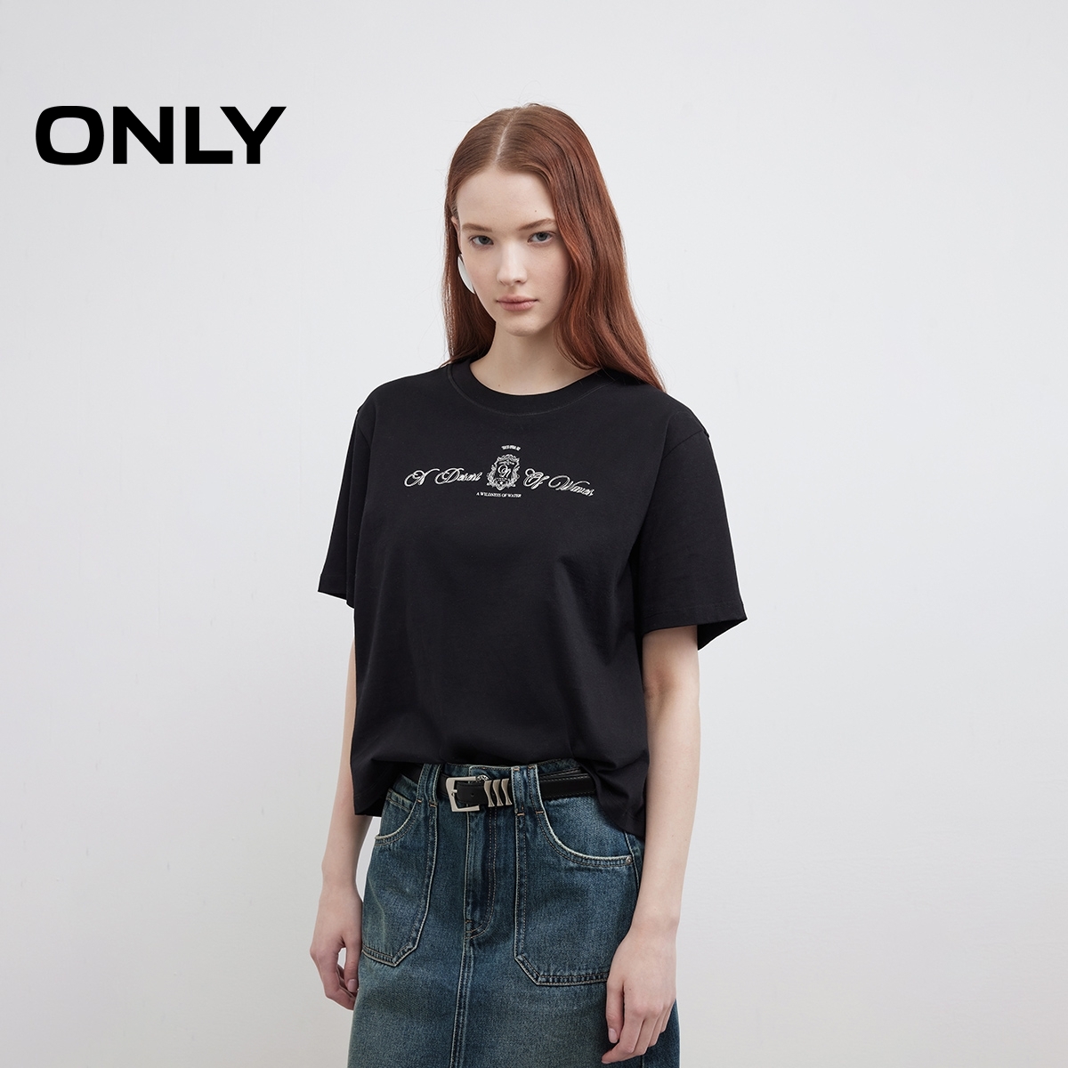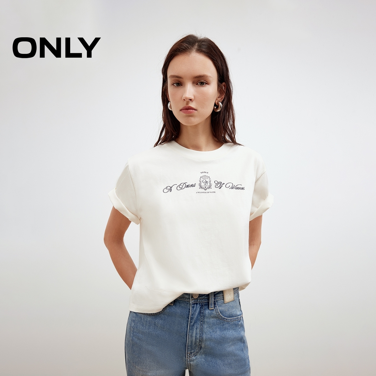 o区绫致ONLY25春夏落肩宽松个性字母印花经典圆领纯棉短袖T恤女