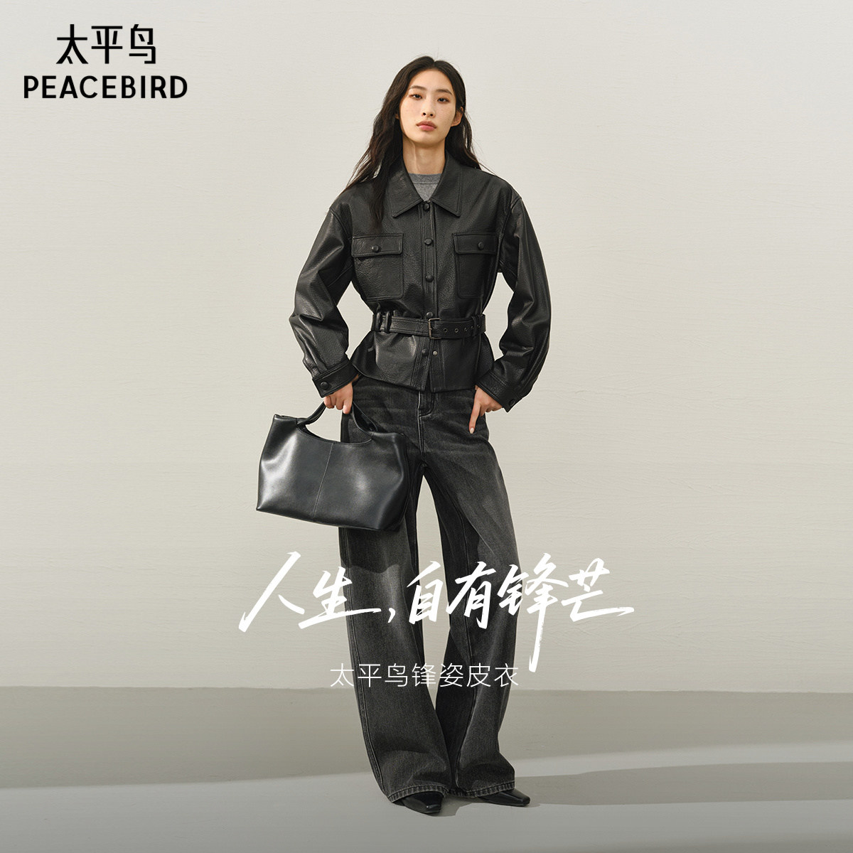 【秀场同款】太平鸟黑银时代锋姿真皮皮衣短款风衣版A1BDF4144*