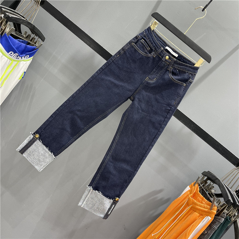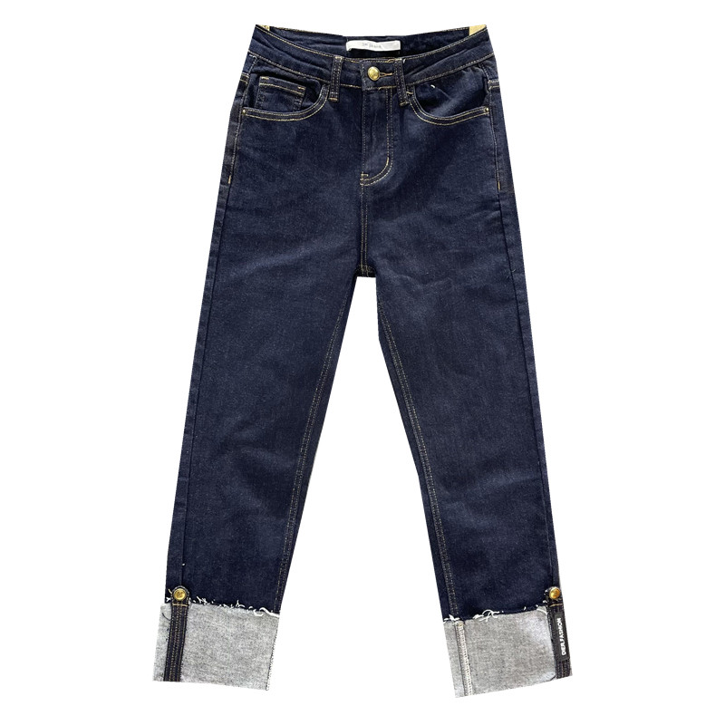 欧货深蓝色牛仔直筒裤女2025秋季新款百搭高腰显瘦卷边九分烟管裤