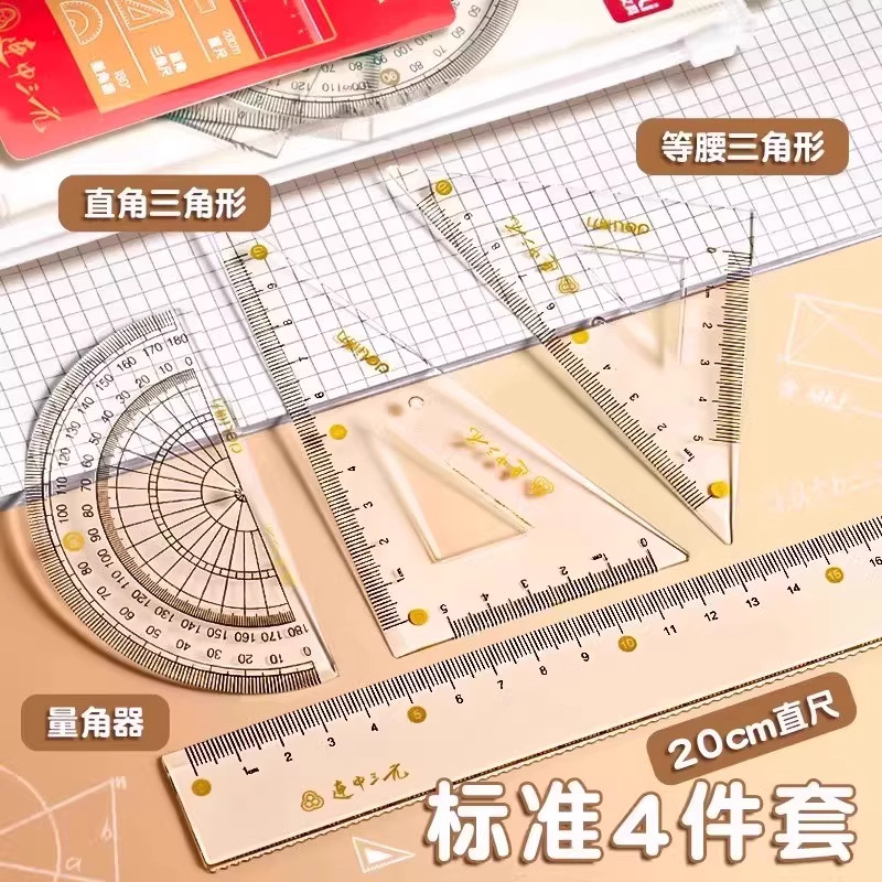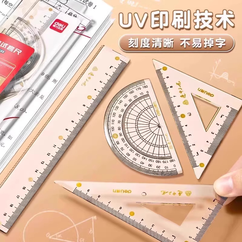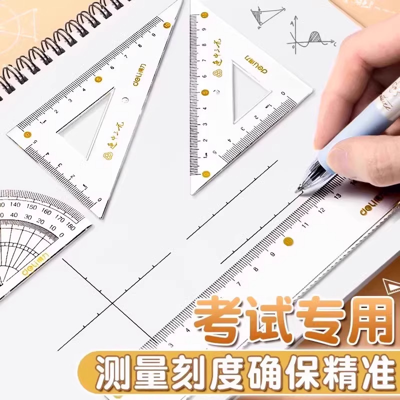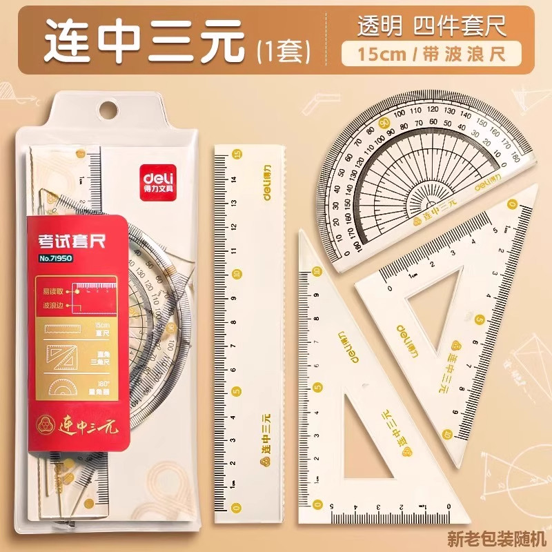 【考试专用4件套尺】得力连中三元考试尺三角板直尺15cm带波浪量角器高透清晰学生用品测量工具套装学习文具