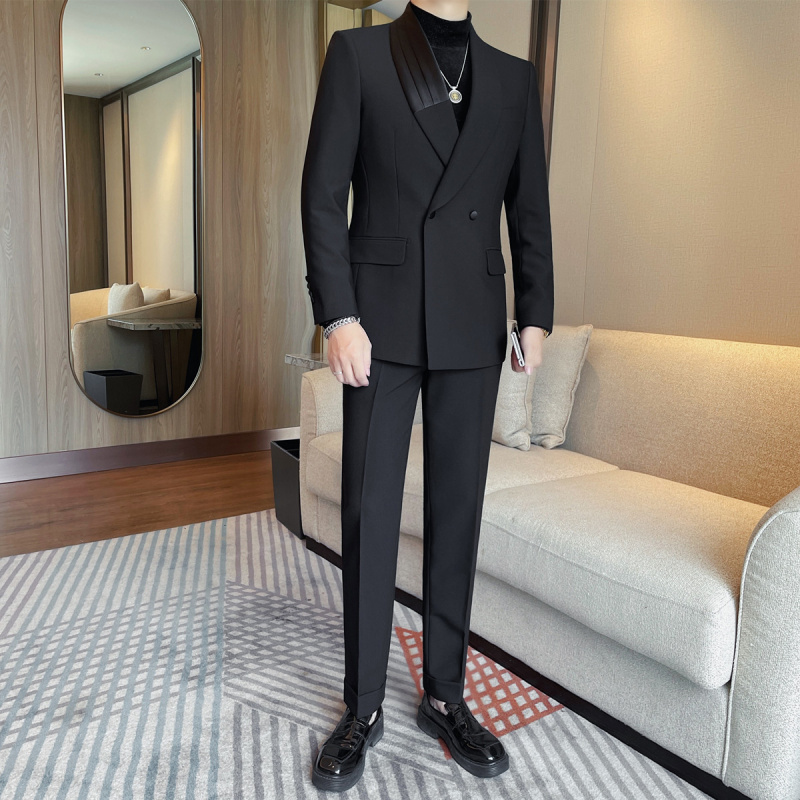 秋冬新款青果领绅士西服套装男士高定商务休闲修身双排扣西装外套