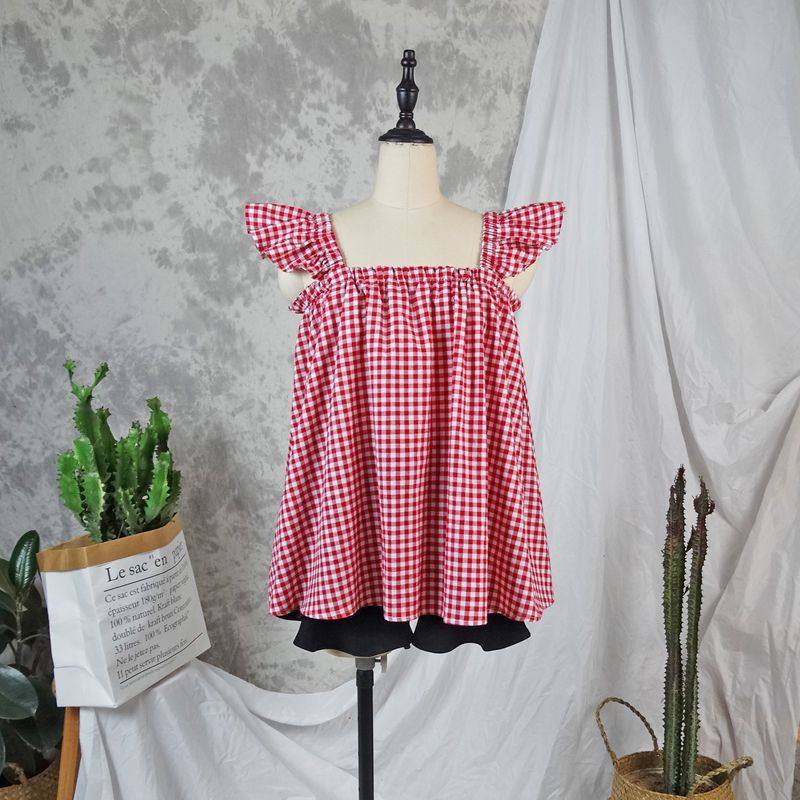 飞袖短款格子娃娃衫抹胸纯棉背心