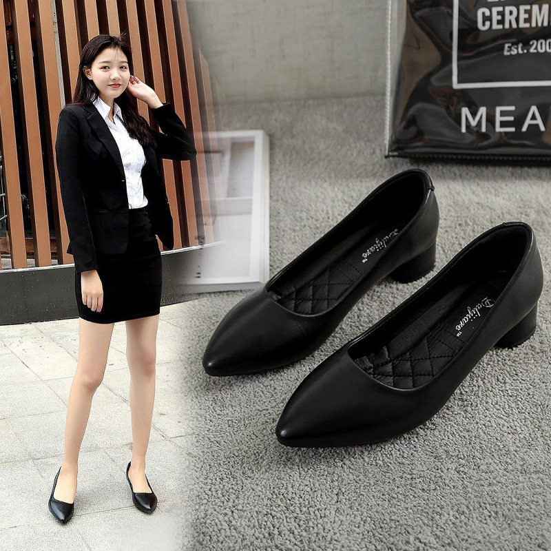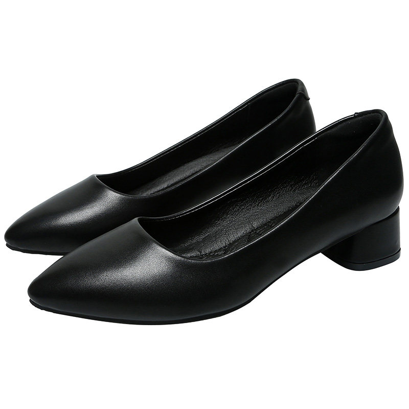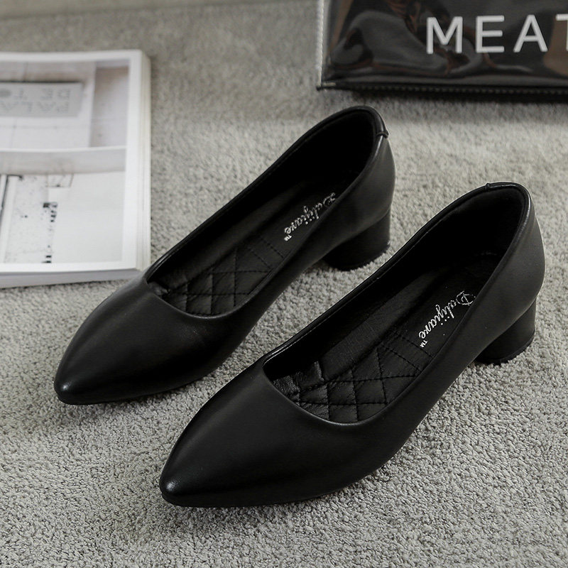工作鞋子女黑色20n21新款夏季职业上班皮鞋尖头软底中跟粗跟单鞋