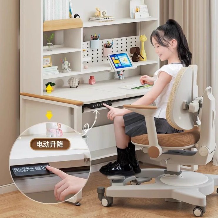 “普瑞灯珠”自然光护眼轻奢学习桌一键电动升降儿童实木书桌