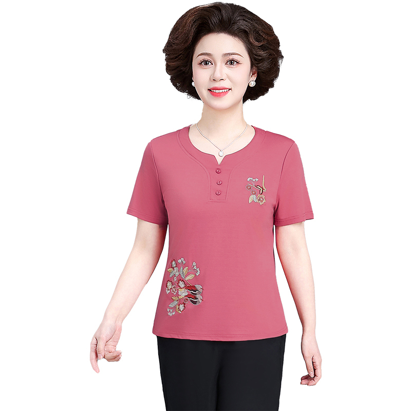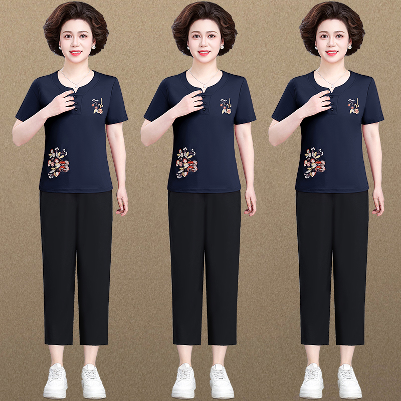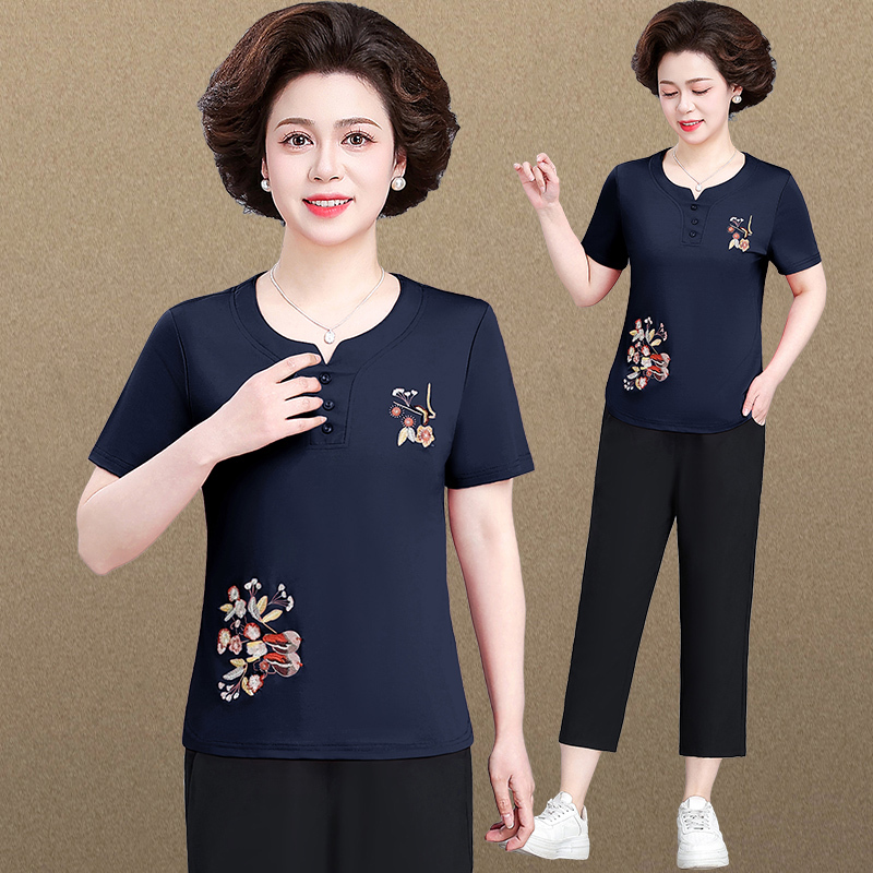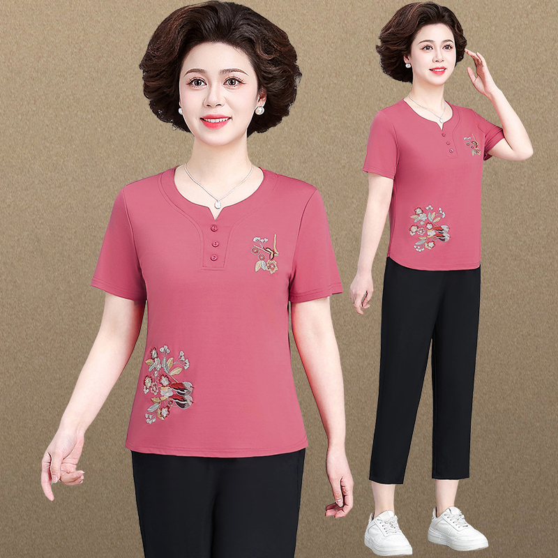 中老年妈妈夏季短袖小衫刺绣休闲套装女大码老奶奶减龄上衣两件套