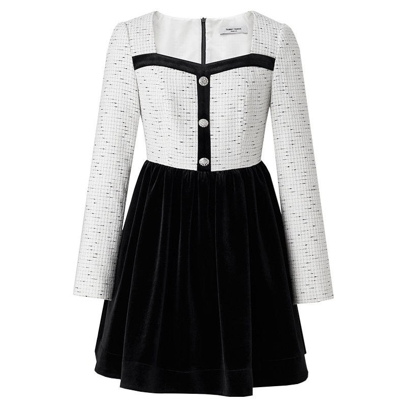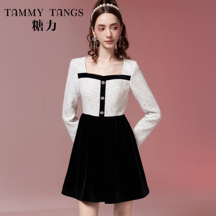 【商场同款】糖力 财阀千金 秋冬季拼色长袖编织小香风连衣裙女