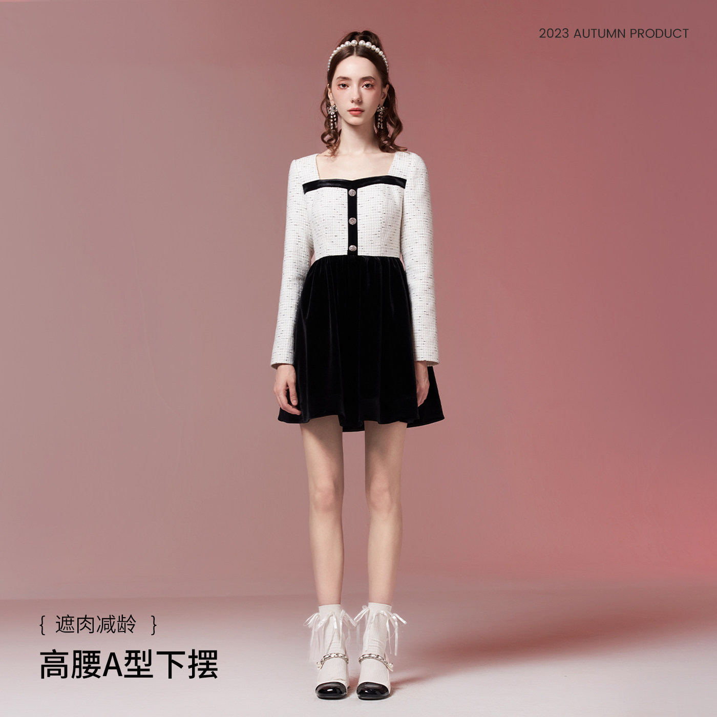 糖力小香风编织连衣裙女拼色长袖