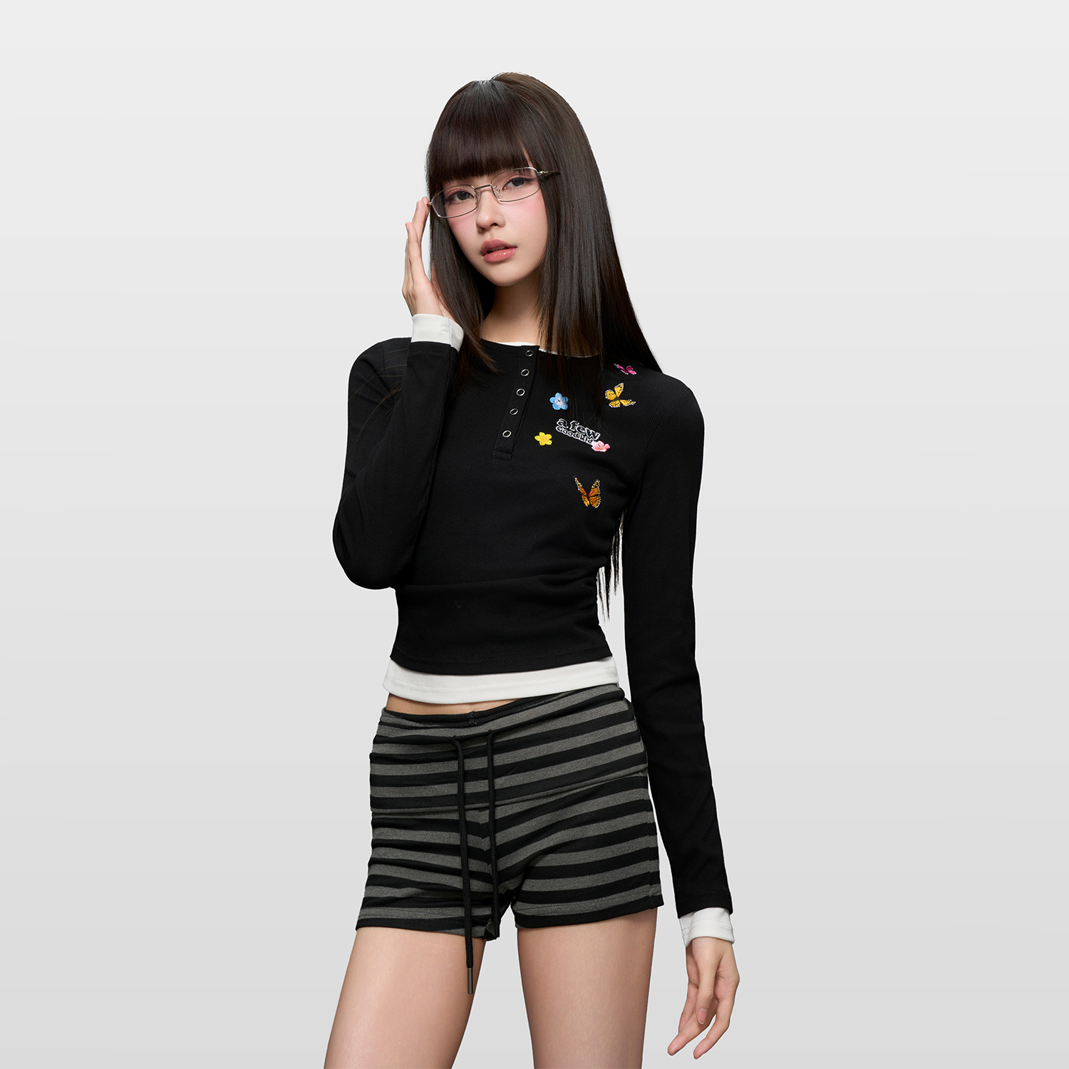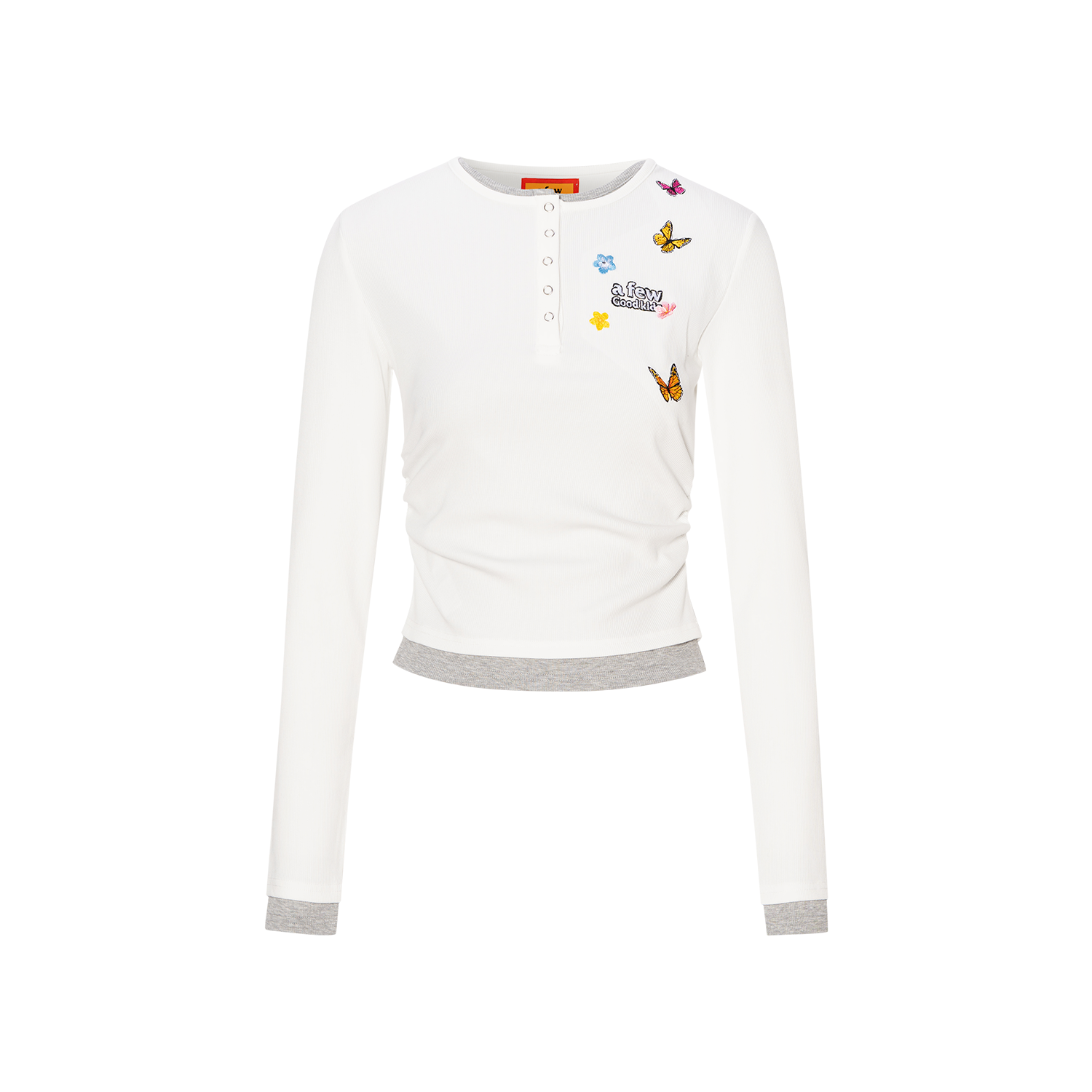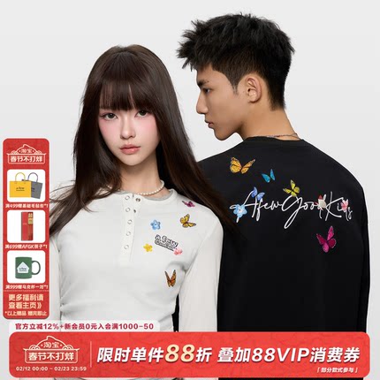 AFGK25FW亨利领蝴蝶刺绣假两件长袖T恤男女修身显瘦秋上衣情侣装